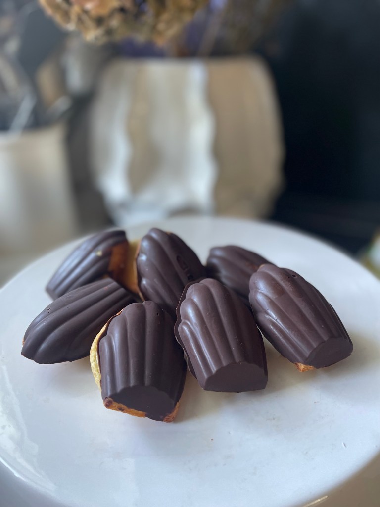 - Lasciare raffreddare le Madeleine per 2 minuti. Quindi sollevali delicatamente dallo stampo in silicone Madeleine e lasciali raffreddare su una griglia di raffreddamento mentre fai la copertura al cioccolato.