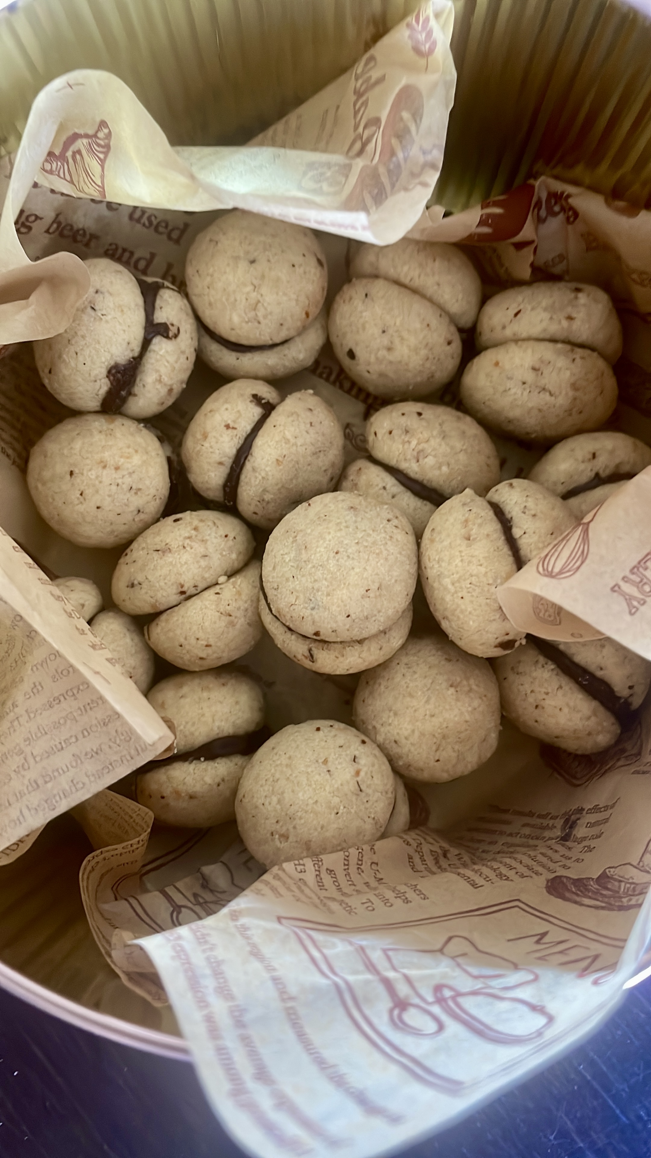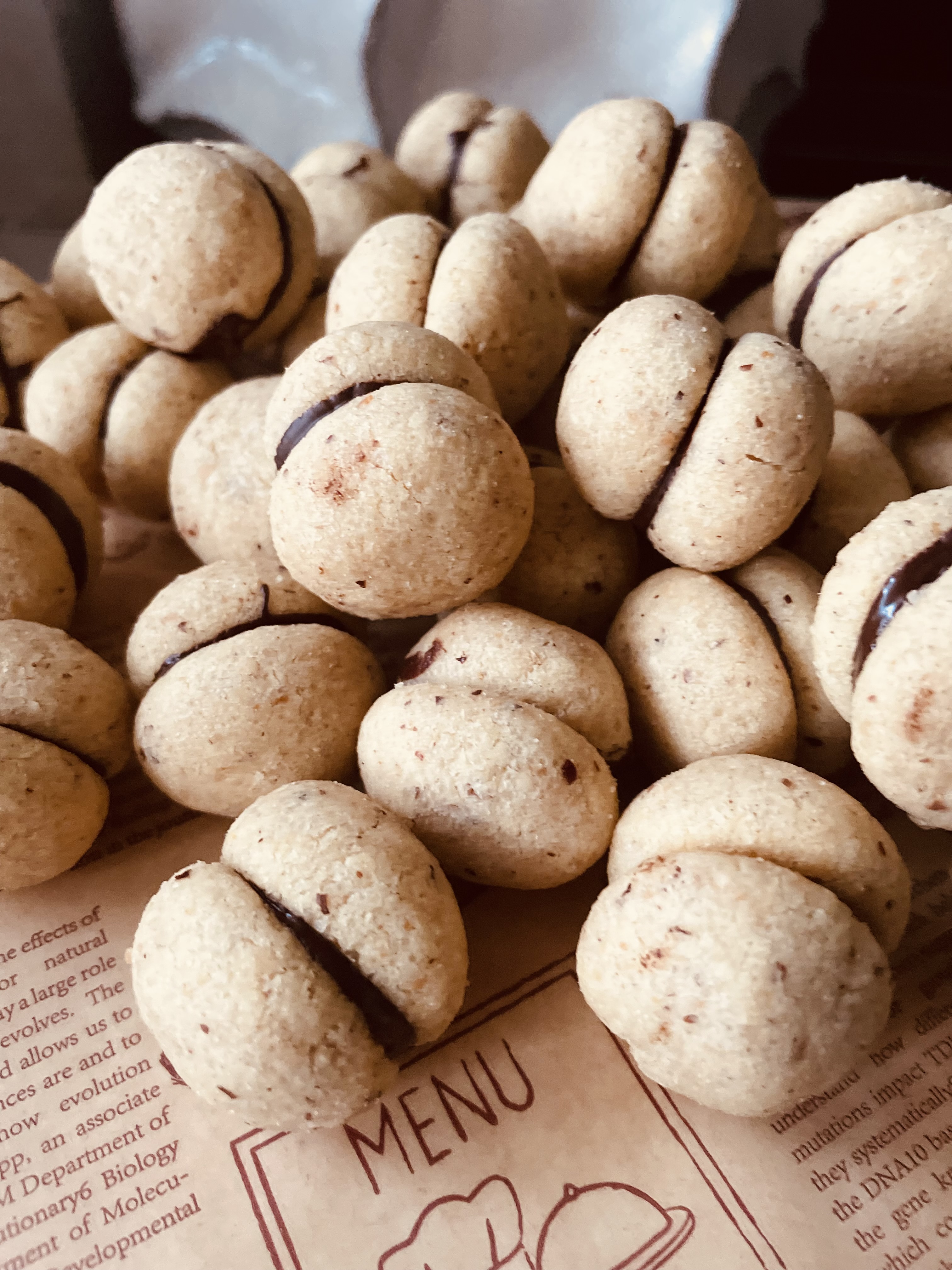 - fare raffreddare, guarnire sulla metà dei biscotti il cioccolato sciolto a bagnomaria lasciare rassodare un poco.
