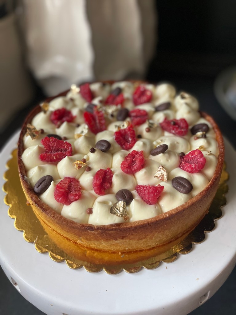 - Finire di decorare con perle di cioccolato, frutta fresca, chicchi di caffè al cioccolato e foglie d’oro alimentari.