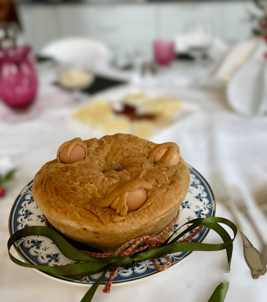 - Ungete di strutto uno stampo largo col buco centrale; disponetevi il rotolo di pasta a ciambella, unendone bene le estremità mettere le 4 uova crude (precedentemente sciacquate) sulla superficie. Con la pasta messa da parte formare dei piccoli salsicciotti e metterli a croce sulle uove.