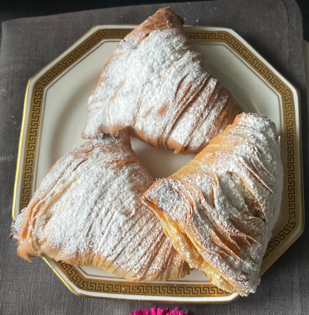 - a questo punto avrete ottenuto un cono, riempitelo con il ripieno che deve essere abbondante fino quasi a fuoriuscire, chiudete leggermente la parte finale e mettete la sfogliatella in un teglia su carta forno.