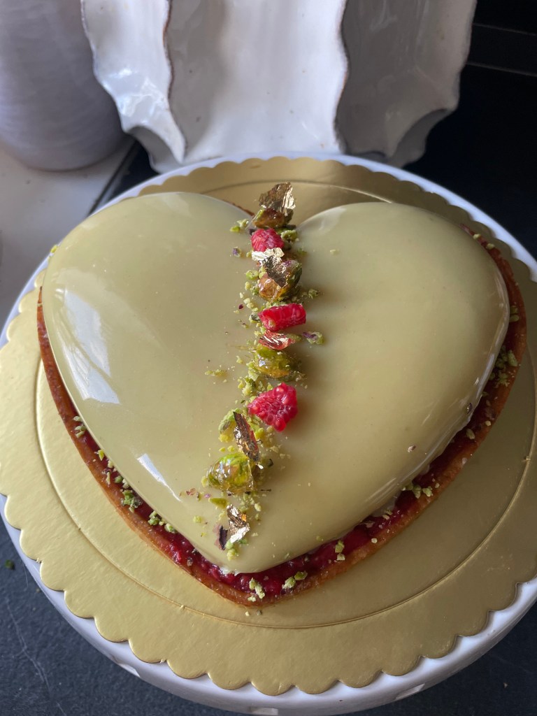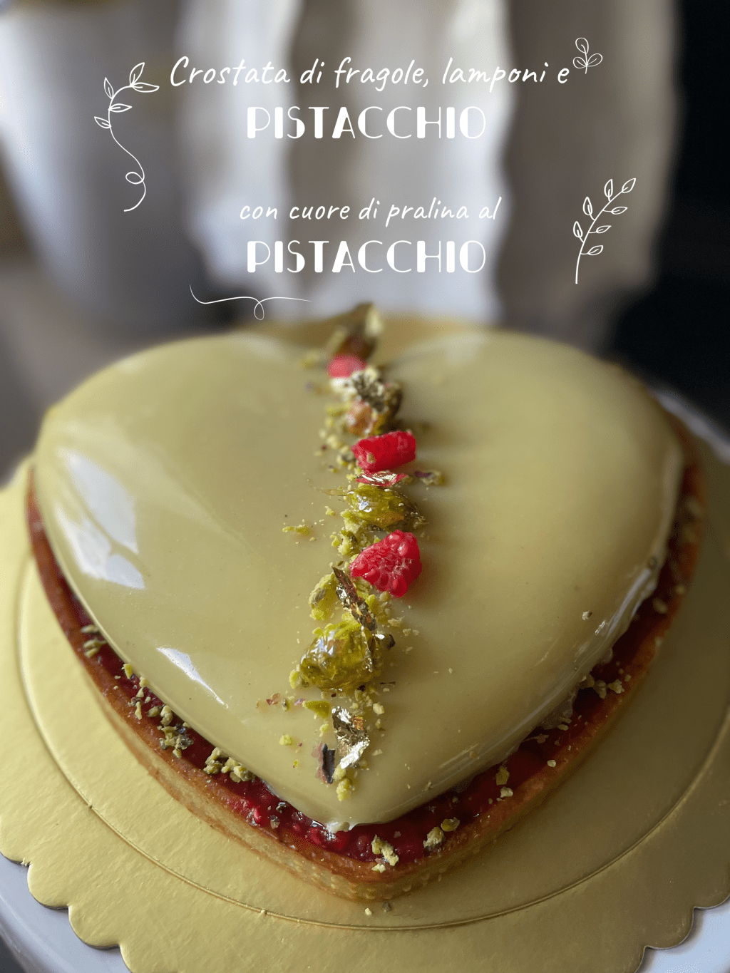 Questa crostata è formata da una pasta frolla al pistacchio, un frangipane al pistacchio, una confit di lamponi e fragole, il cuore di mousse al pistacchio con un inserto di pralina al pistacchio , una glassa a specchio al pistacchio