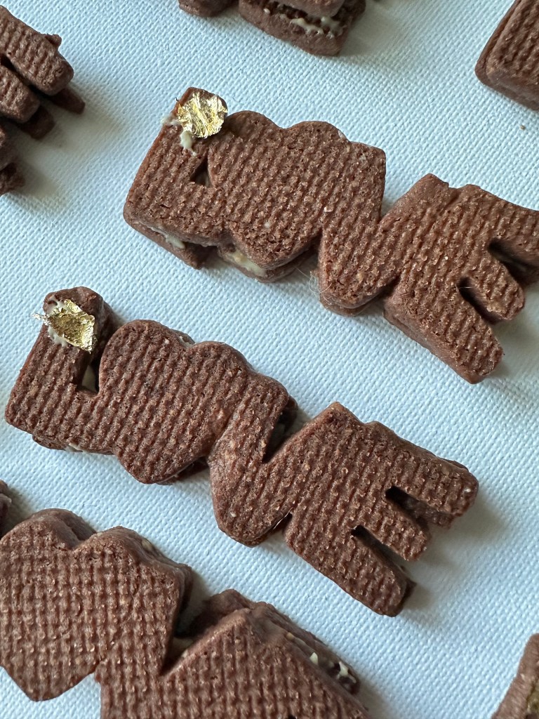 - versare una goccia di cremino su ogni biscotto e decorare con la foglia oro.