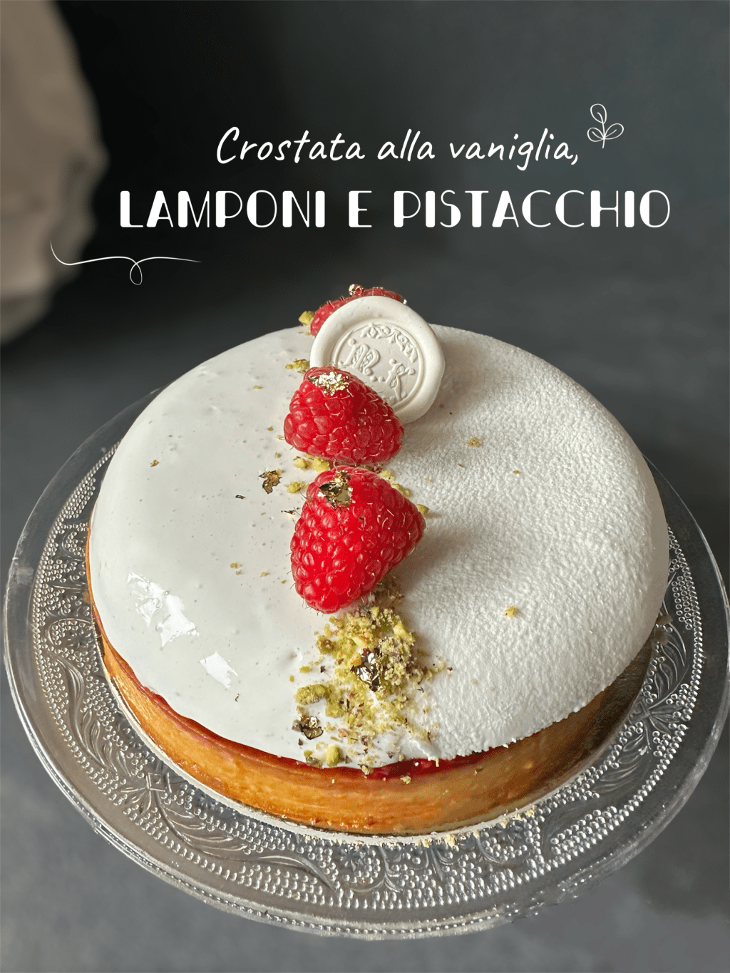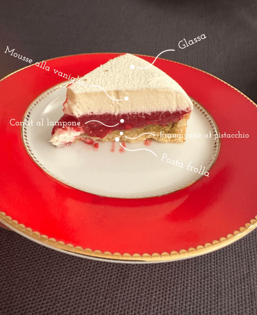 Questa crostata è formata da una pasta frolla al pistacchio , un frangipane al pistacchio, una confit di lamponi, una cupola alla vaniglia, una glassa a specchio color bianco e una finitura spray chablonage effetto velluto bianco