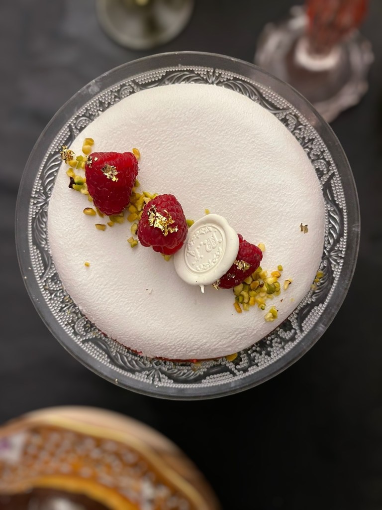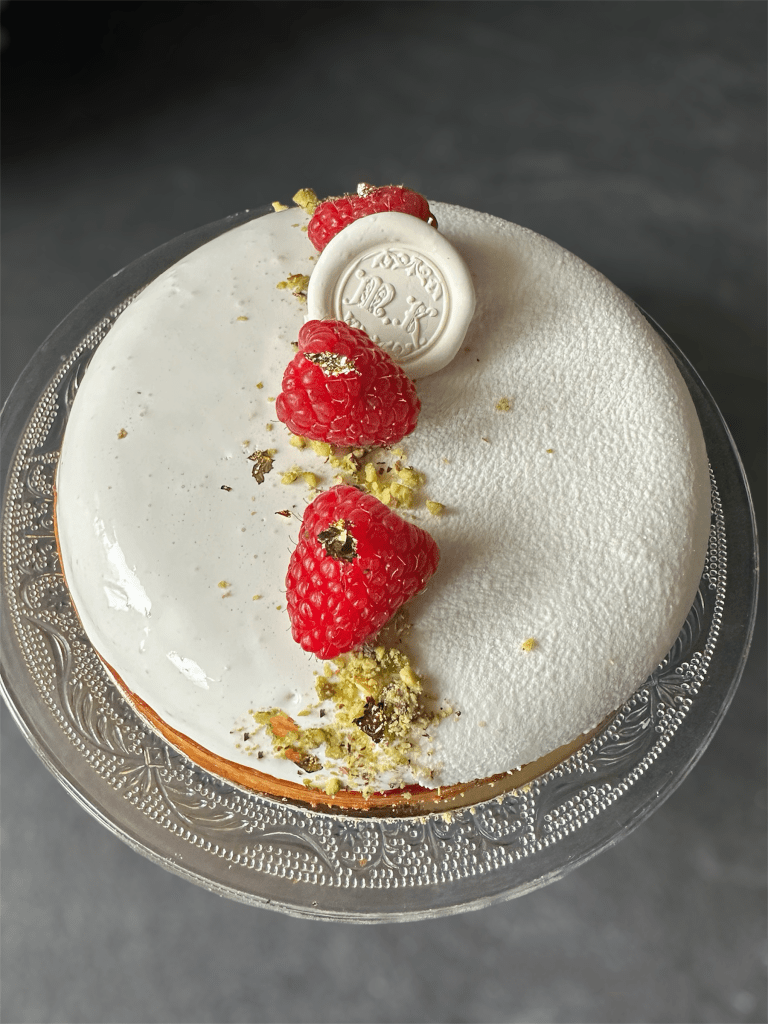 - Decorare con lamponi, granella di pistacchio e foglia oro