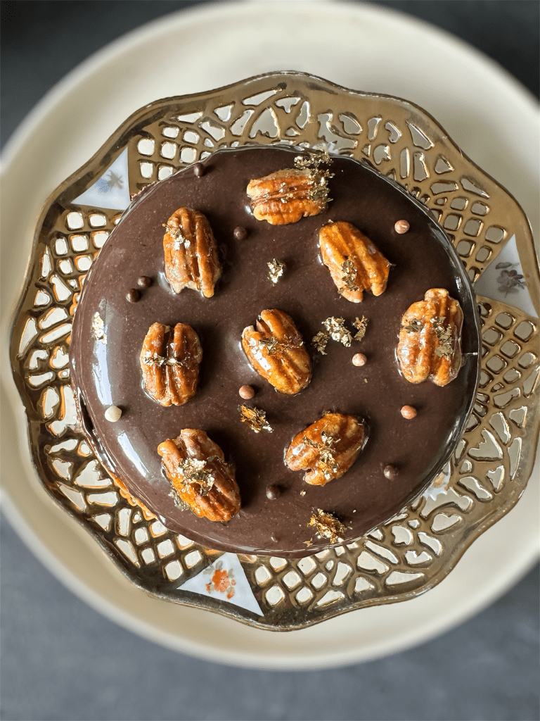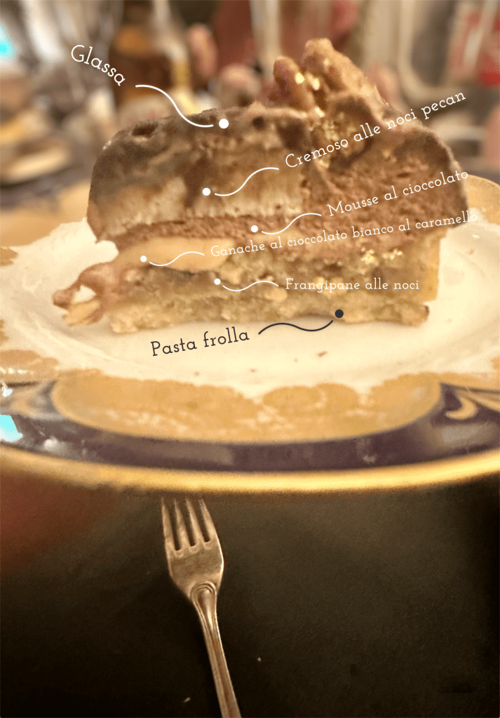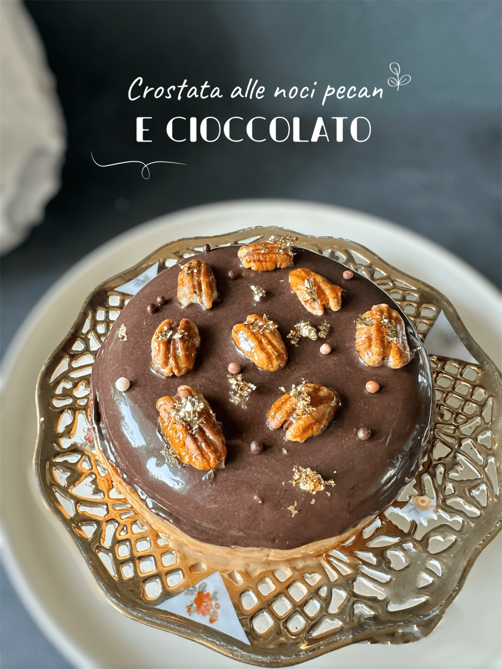 Questa crostata è formata da una pasta frolla alle noci, un frangipane alle noci e noci pecan, una ganache di cioccolato bianco e caramello, da una mousse cioccolato fondente con un inserto di cremoso alle noci pecan, una glassa a specchio al cioccolato fondente