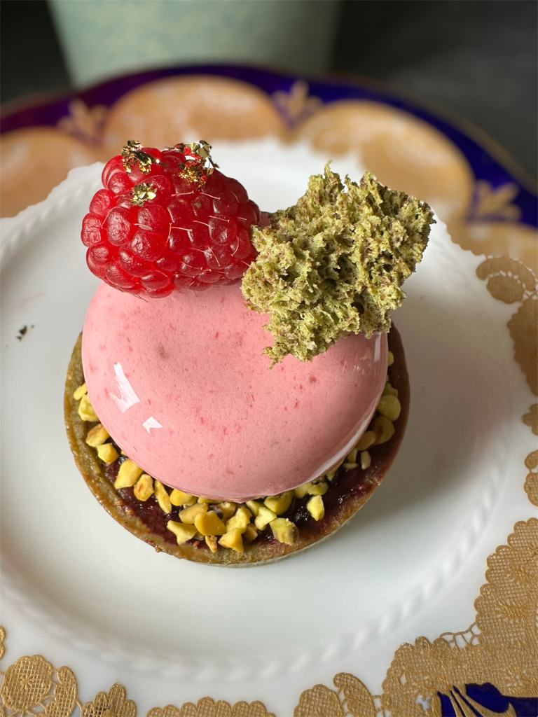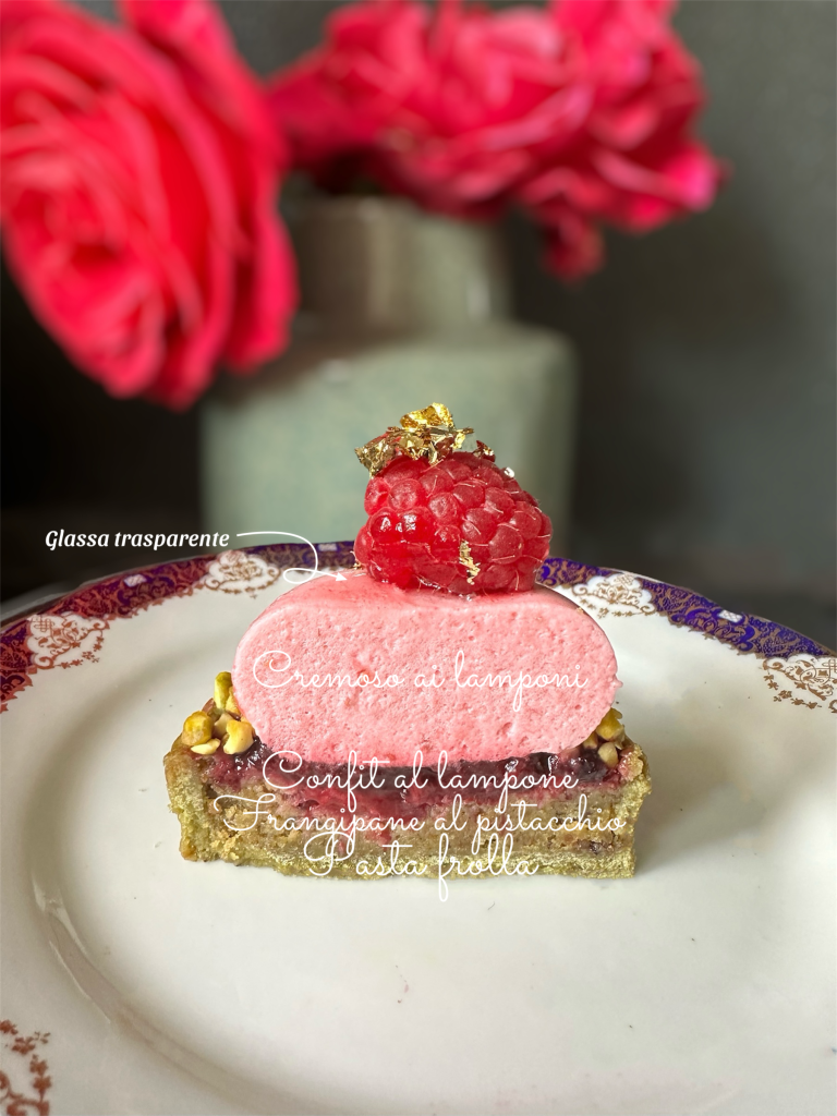 Questa tartelletta è formata da una pasta frolla al pistacchio e the matcha , un frangipane al pistacchio e lamponi, una confit di lamponi, una cupola di cremoso ai lamponi, una glassa trasparente