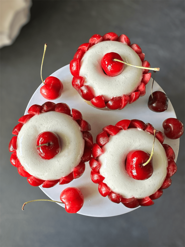 - Guarnire con le ciliegie denocciolate e tagliate a meta