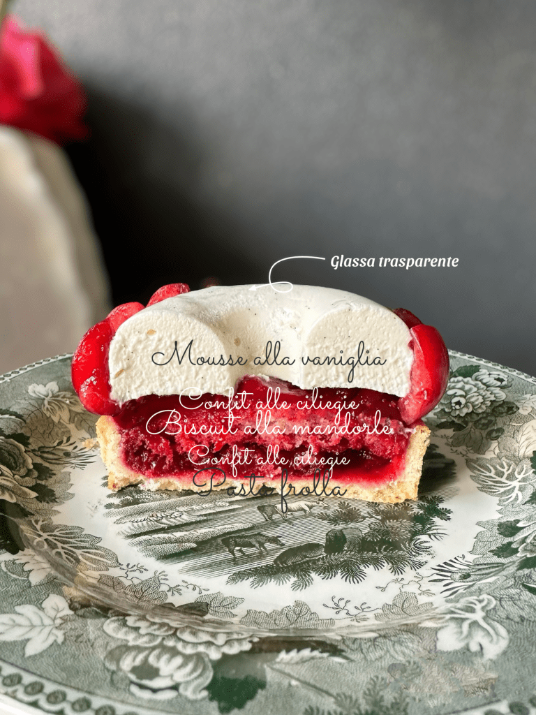 Questa crostata è formata da una pasta frolla alle mandorle , un biscuit alle mandorle, una confit di ciliegie , una ciambellina alla vaniglia, una glassa trasparente