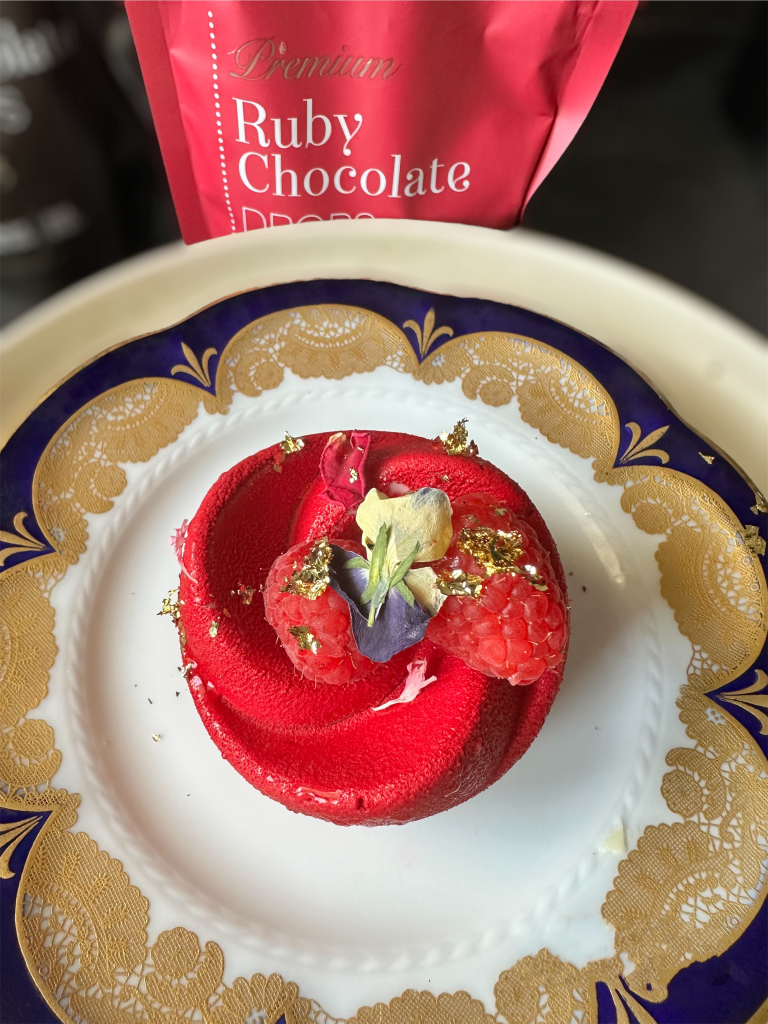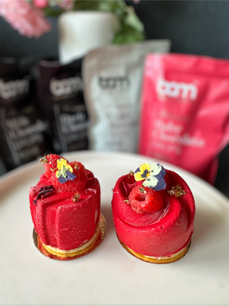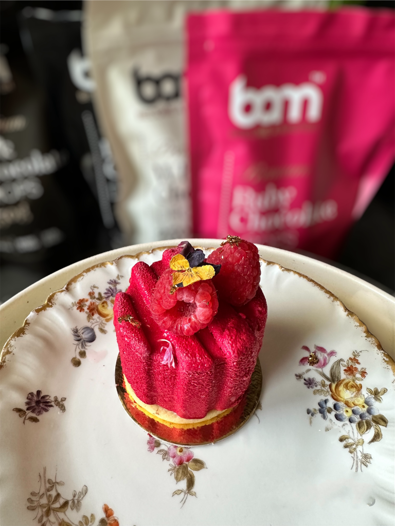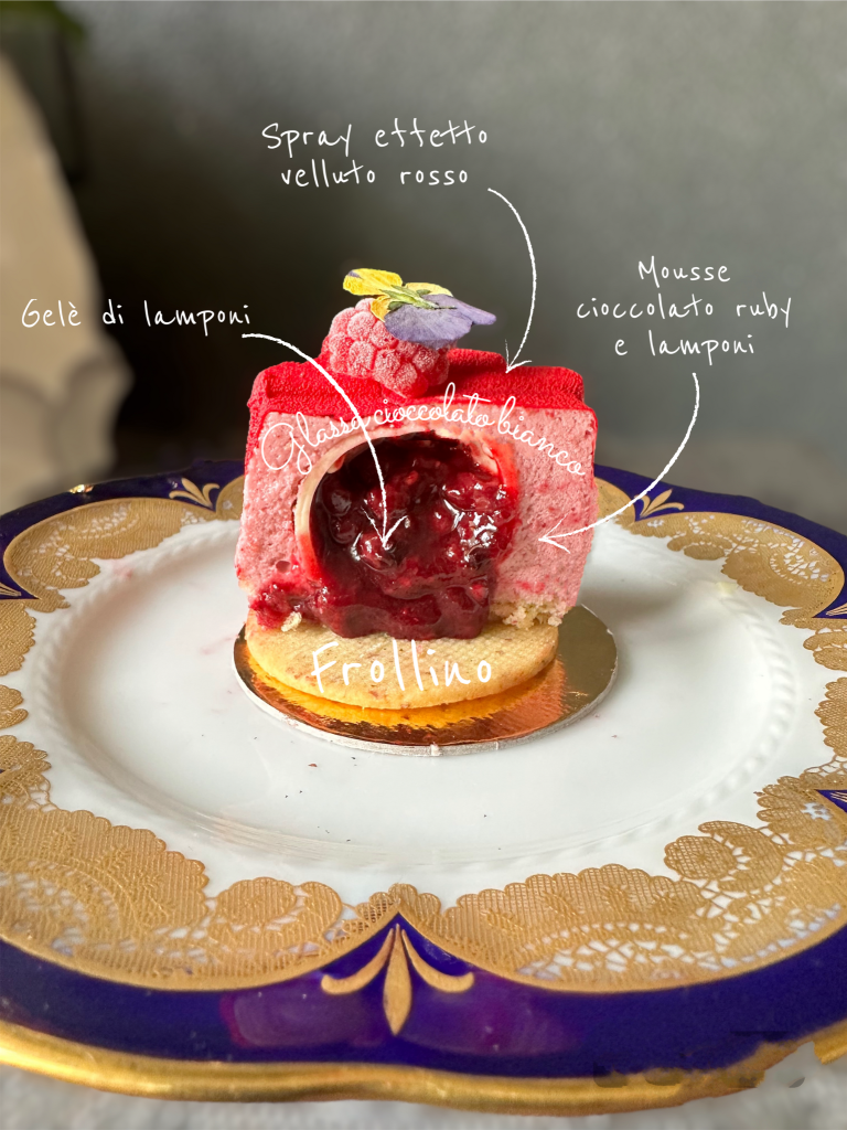 Questo tortino è formata da una base spugnosa di biscuit ai lamponi, da un inserto di confit ai lamponi racchiuso in una glassa al cioccolato bianco, da una parte esterna di mousse ai lamponi e da un finitura di spray chablonage effetto velluto rosso