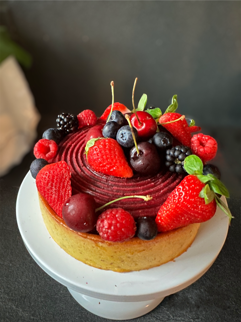 Questa crostata è formata da una pasta frolla alle mandorle, un biscuit alle mandorle , una confit di frutti rossi un Gelè ai frutti rossi