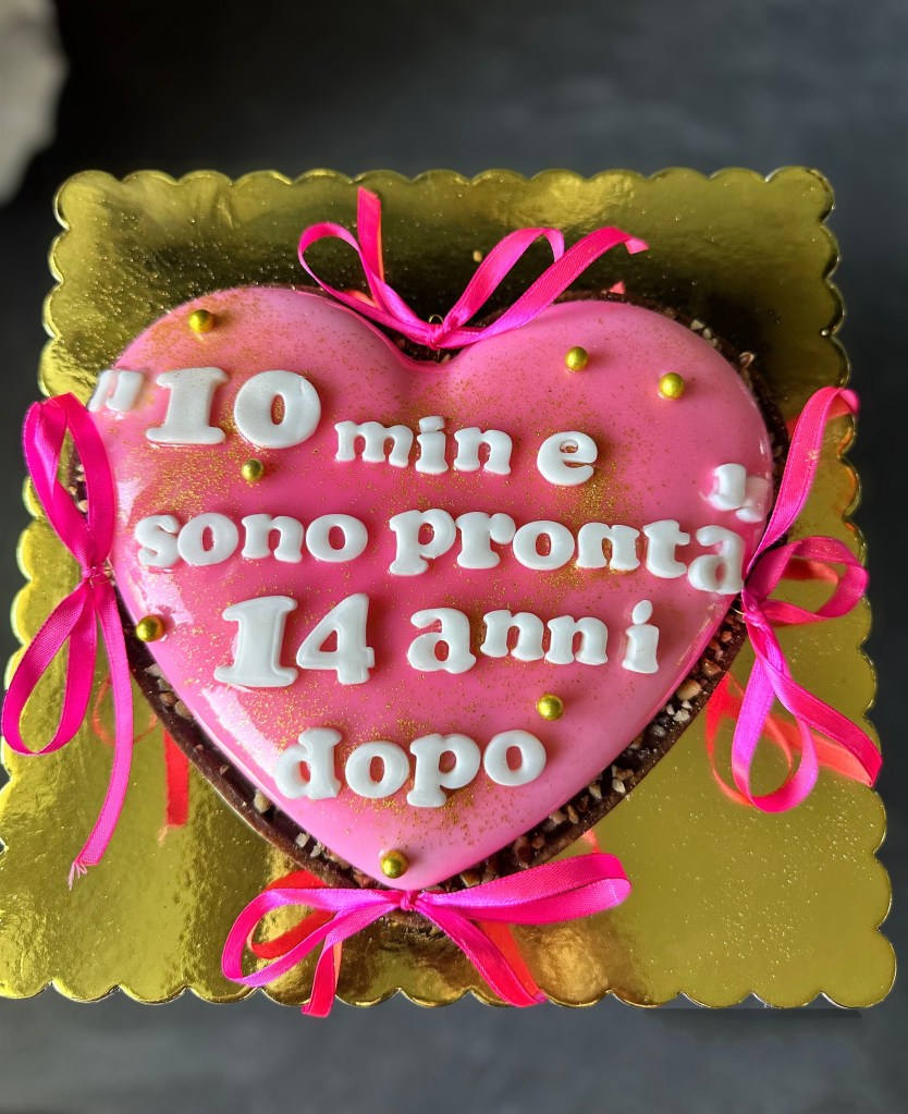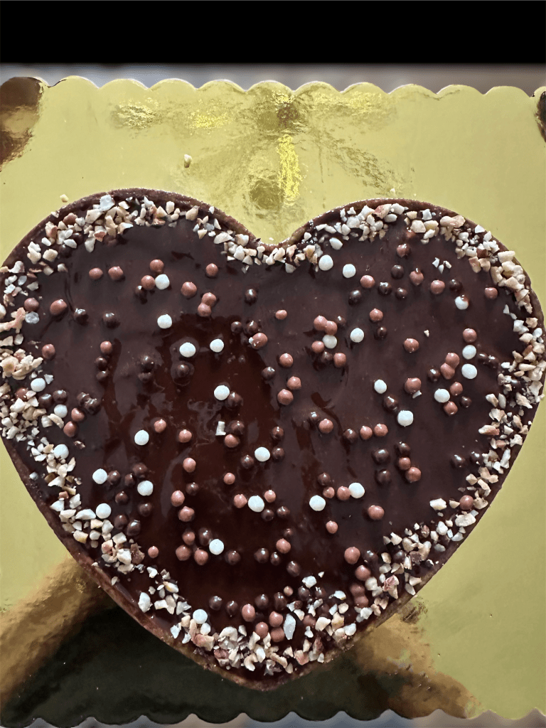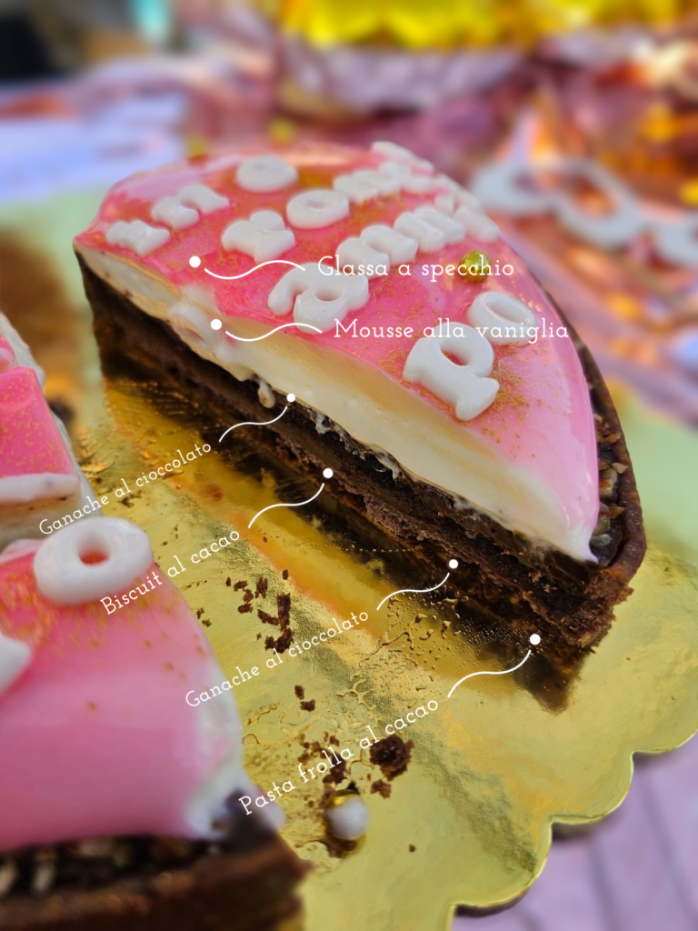 Questa crostata è formata da una pasta frolla al cacao e nocciola, da uno strato di ganache al cioccolato, un biscuit al cacao, da un altro strato di ganache al cioccolato e palline di Cioco cereali, e sopra il cuore di mousse alla vaniglia, una glassa a specchio rosa