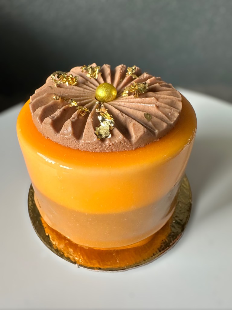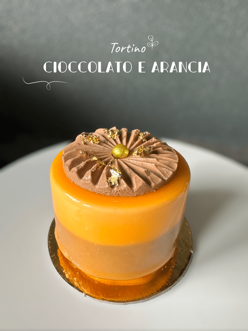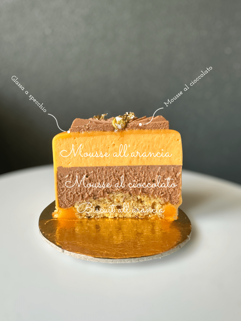 Questo tortino è formata da una base spugnosa di biscuit all’arancia, da una parte esterna di mousse all’arancia e una mousse al cioccolato fondente, da un finitura glassa a specchio di cioccolato all’arancia