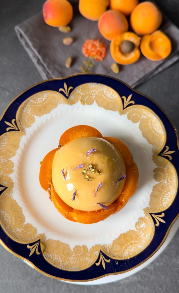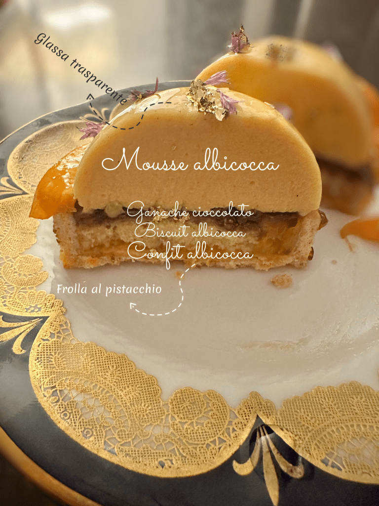 Questa tartelletta è formata da una pasta frolla al pistacchio con granella di pistacchio, un biscuit all’ albicocca , una confit di albicocche, una mezza sfera di mousse all’albicocca , una glassa trasparente