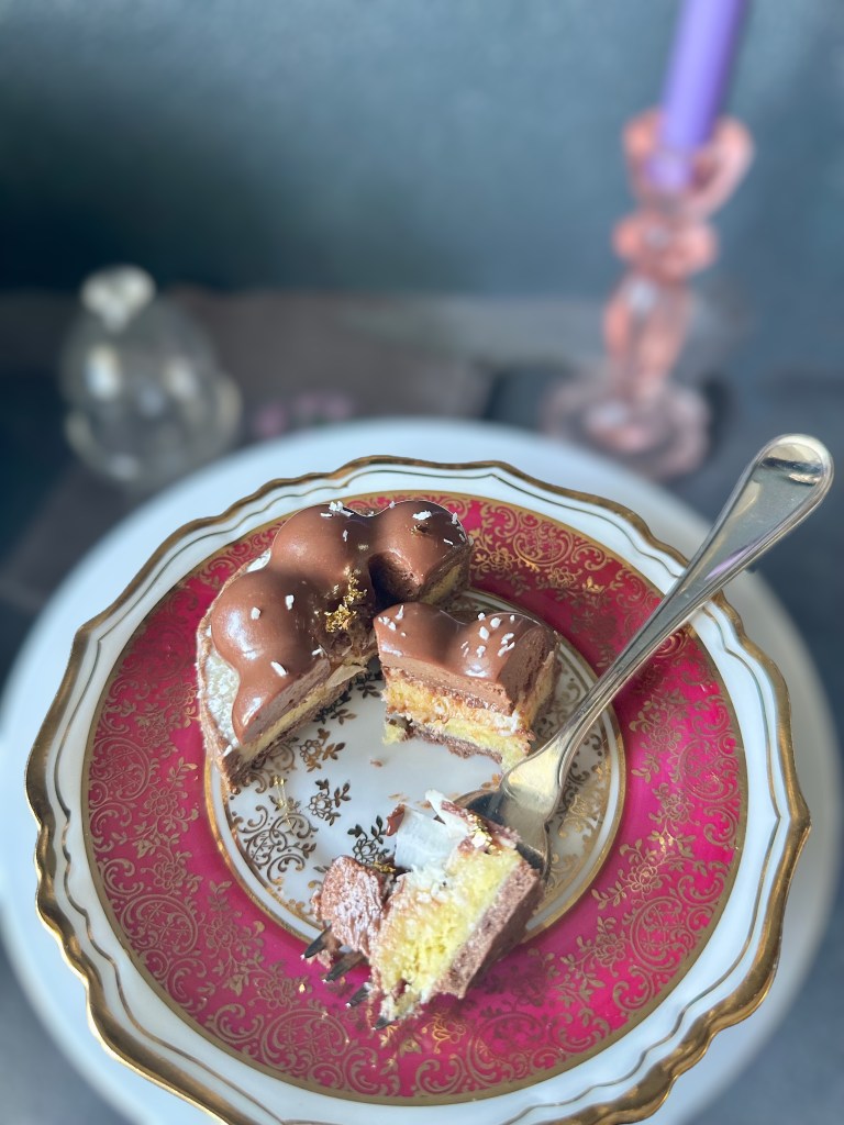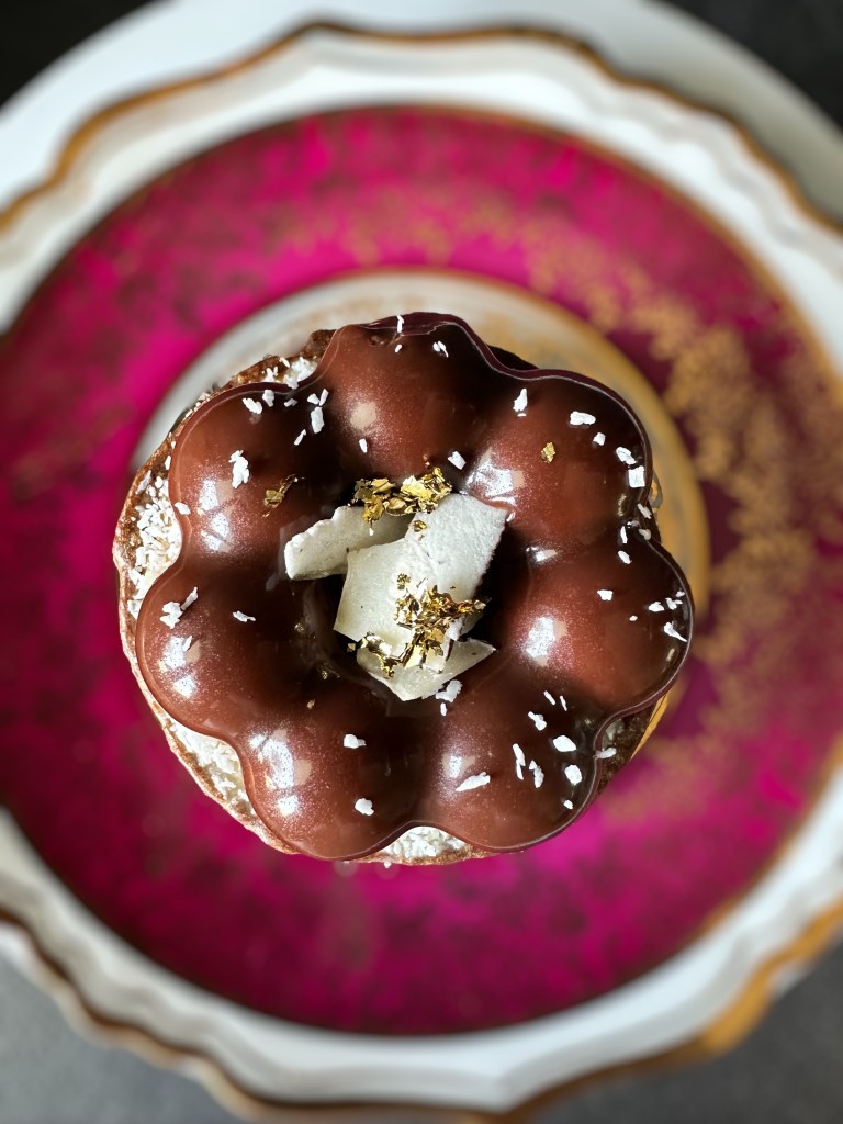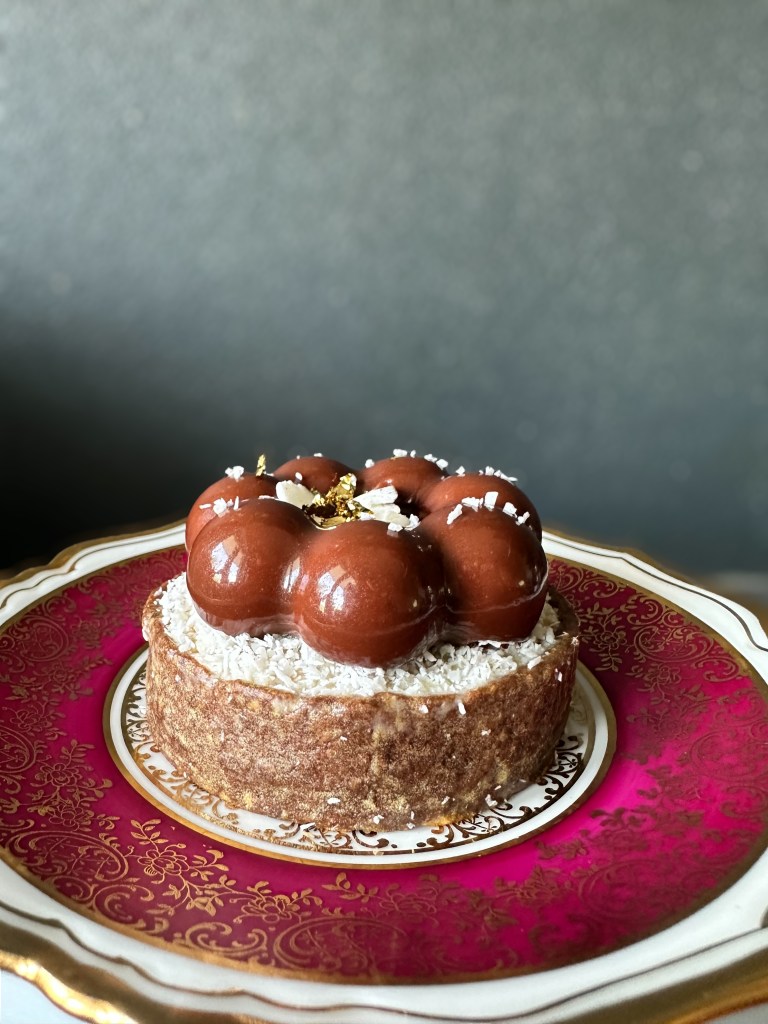 Questa tartelletta è formata da una pasta frolla al cacao, un biscuit al cocco, una ganache al cocco una corona fiore di bavarese al cioccolato , una glassa a specchio al cioccolato