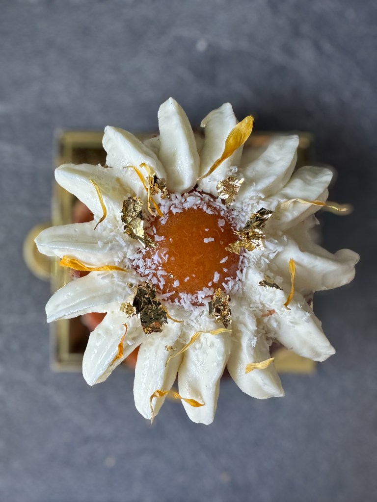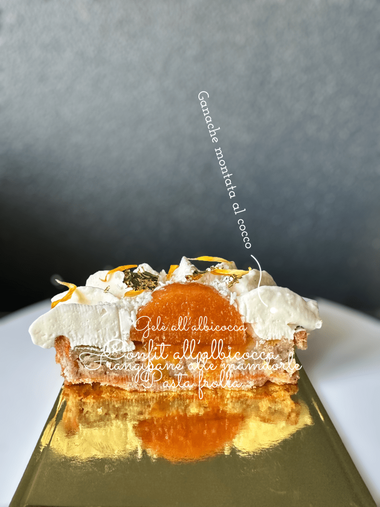 Questa tartelletta è formata da una pasta frolla alle mandorle un frangipane alle mandorle,e albicocche una confit di albicocche, una Gelè all’albicocche, una,granché montata al cocco e una glassa trasparente