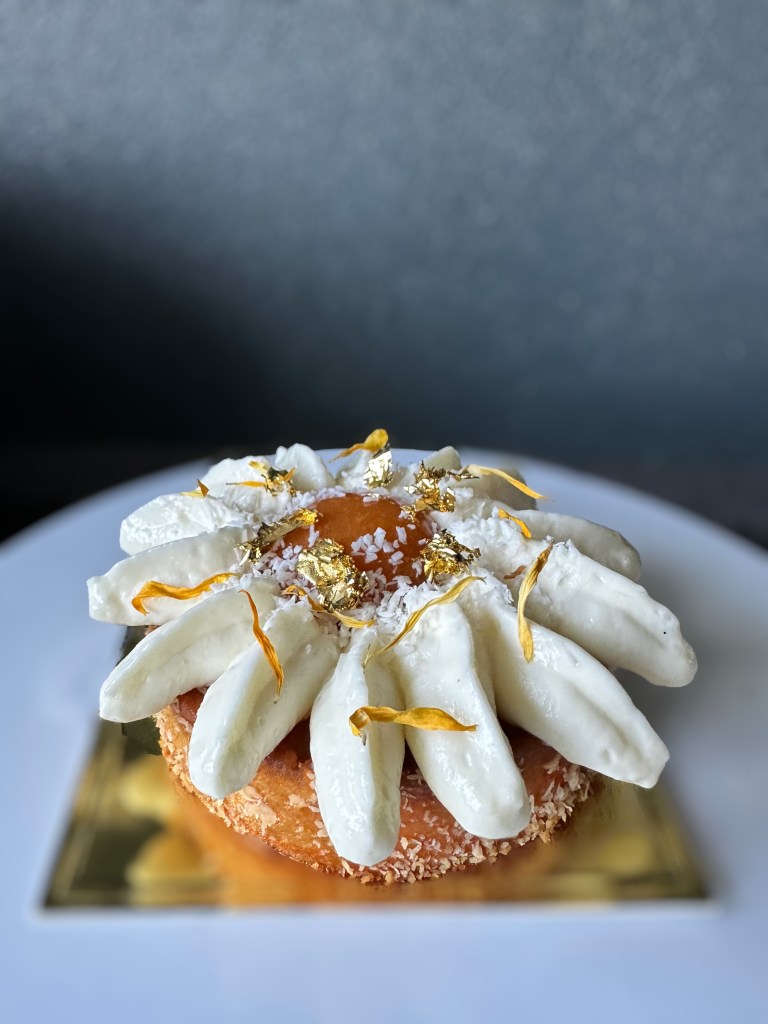 - Montare la ganache di cocco e trasferirla in un una sac a poche con la bocchetta sant honorè, decorare