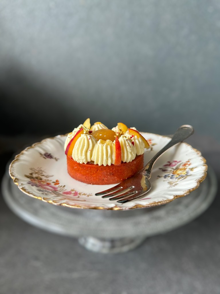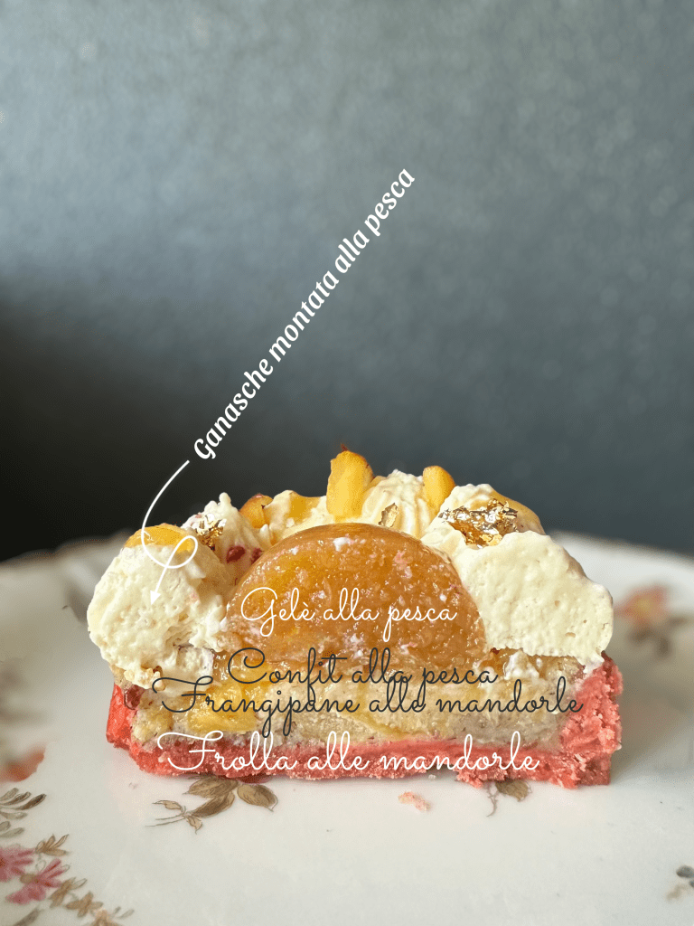 Questa tartelletta è formata da una pasta frolla colorata variegata alle mandorle , un frangipane alle mandorle e pesche, una confit di pesche, una mezza sfera di Gelè alla pesca, una ganache montata alla pesca