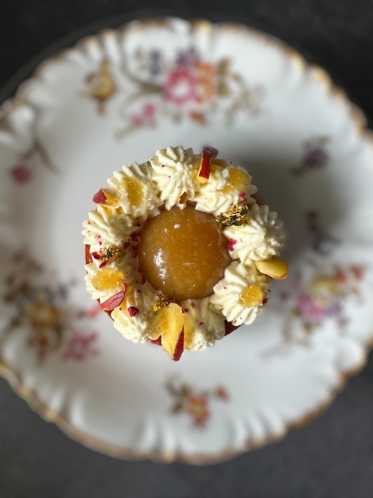- montare con delle fruste elettriche la ganache alla pesca e mettere in sac a poche con beccuccio a stella e formare tanti ciuffetti