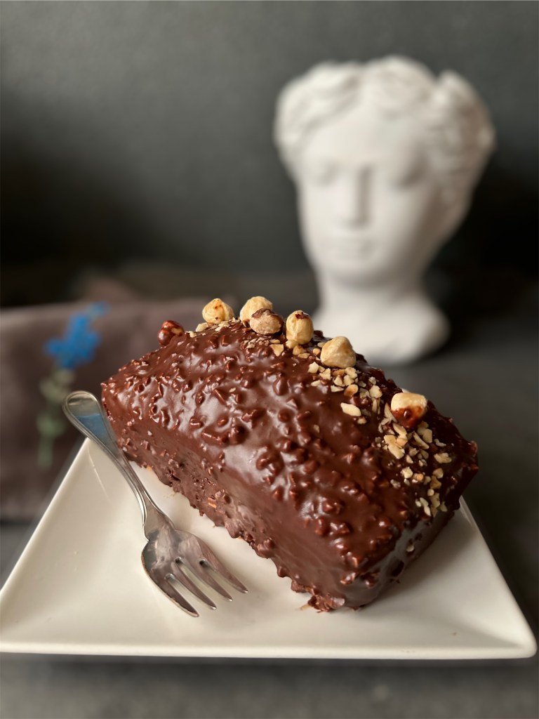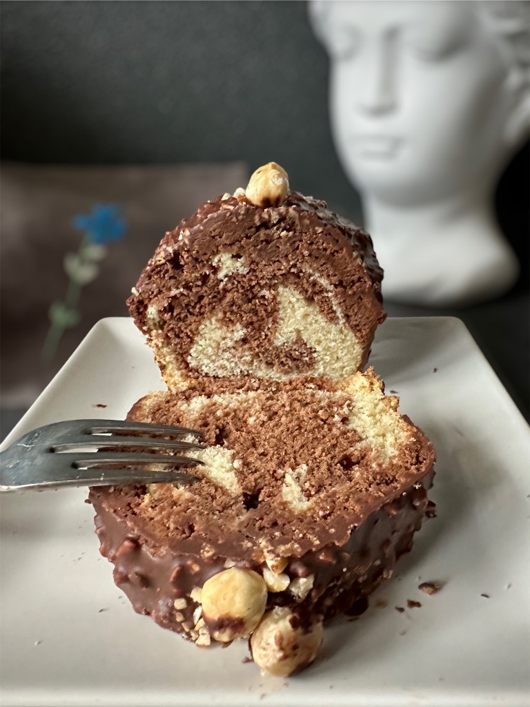 Ecco qui la famosa torta marmorizzata, ricoperta da una deliziosa glassa al cioccolato fondente in stile rock!