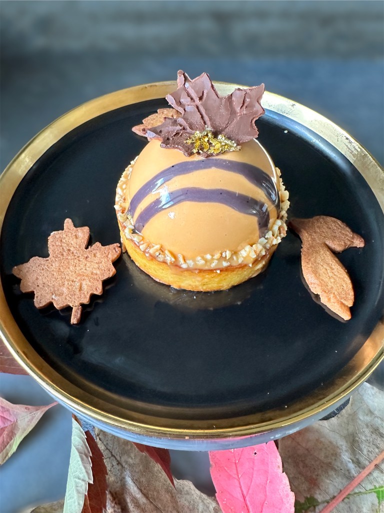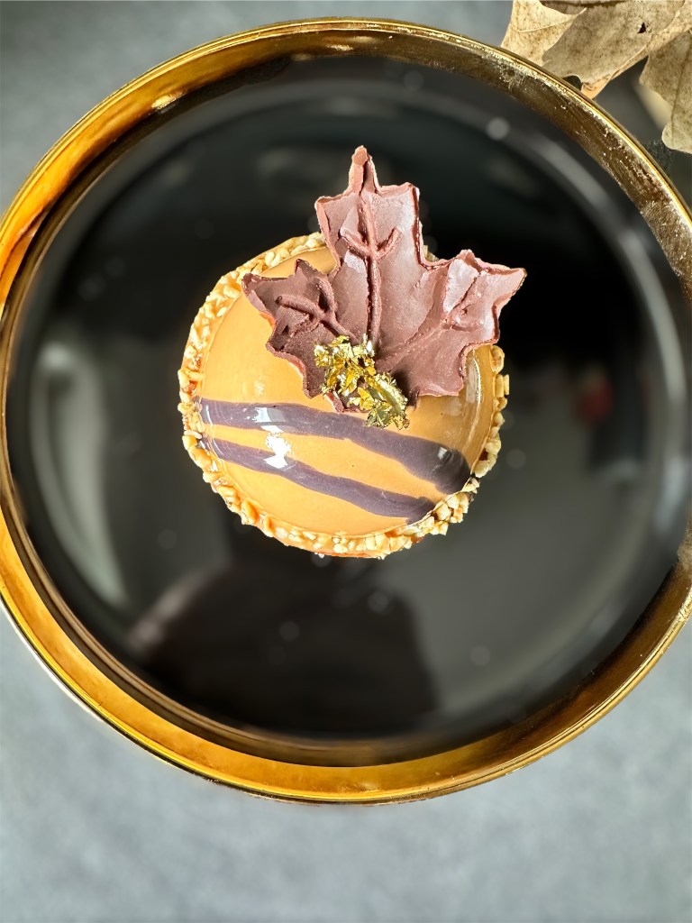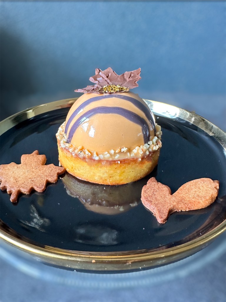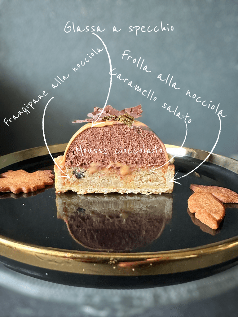 Questa tartelletta è formata da una pasta frolla alla nocciola un frangipane alla nocciola e nocciole intere, uno strato di caramello salato, uno cupola di mousse al cioccolato
