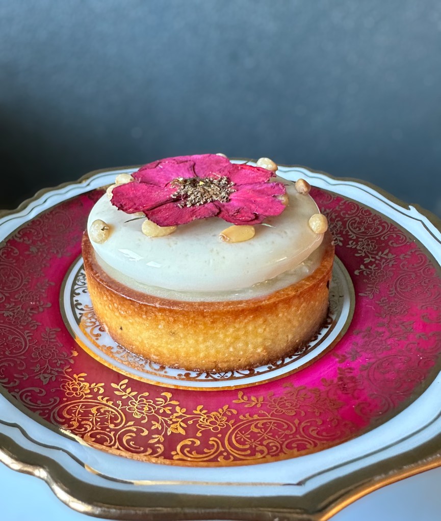 Queste Tartellette sono formate da una frolla alle mandorle, un frangipane alle mandorle e pinoli, una ganache alla vaniglia , una mousse al pralinato ai pinoli, una glassa tasparente.