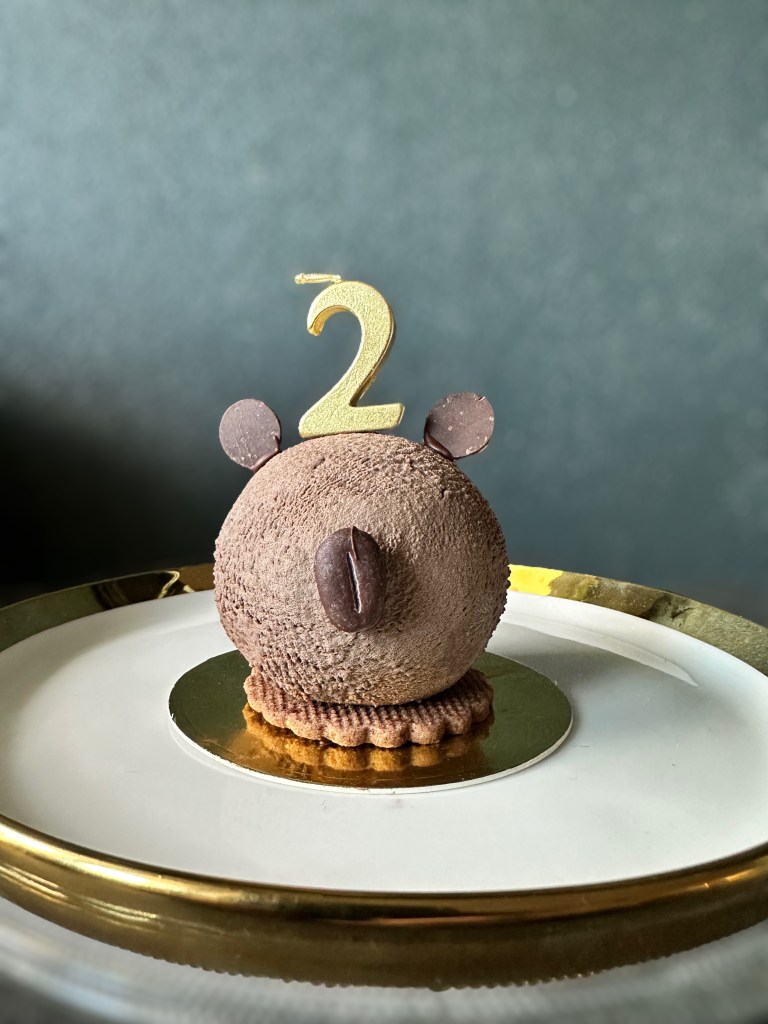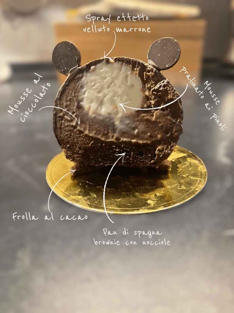 Questo orsetto è formata da una base spugnosa di pan di spagna brownie con nocciole, da un inserto di mousse al pralinato ai pinoli, da una parte esterna di mousse al cioccolato e un finitura di spray chablonage effetto velluto marrone