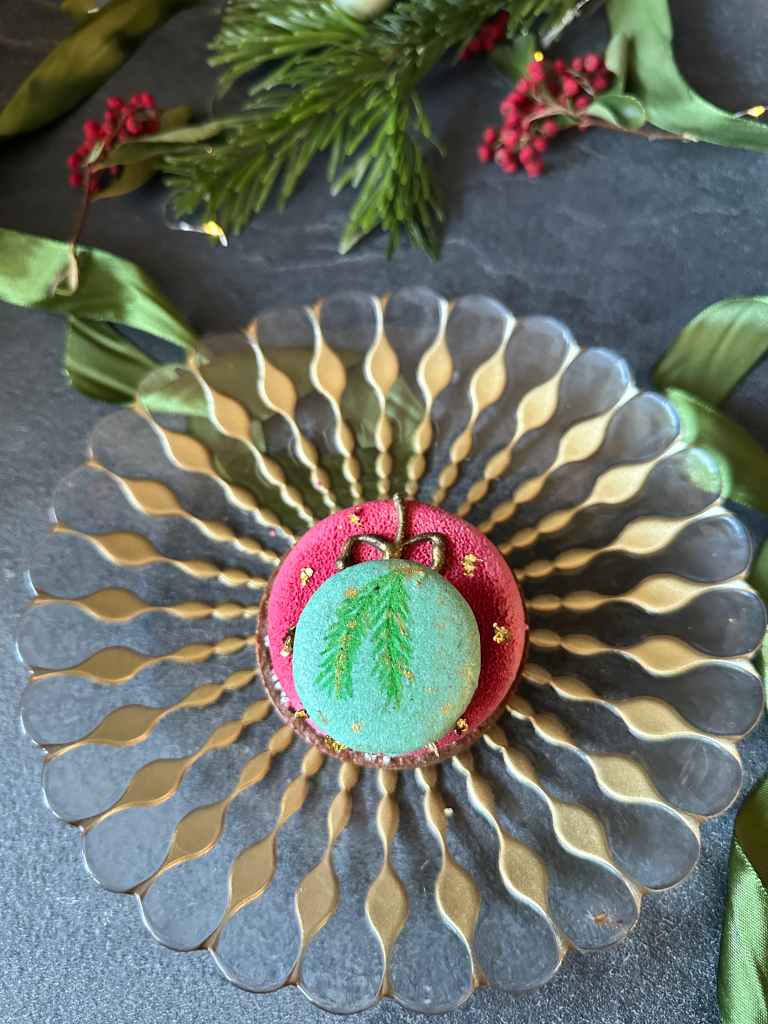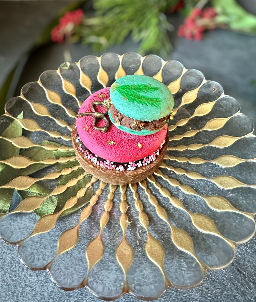 Queste Tartellette sono formate da una frolla al cacao , un Pan di spagna brownie con nocciole , una ganache al cioccolato, un cremoso al toblerone ricoperto da uno spray effetto velluto rosso , un macaron con ganache montata al cioccolato fondente,