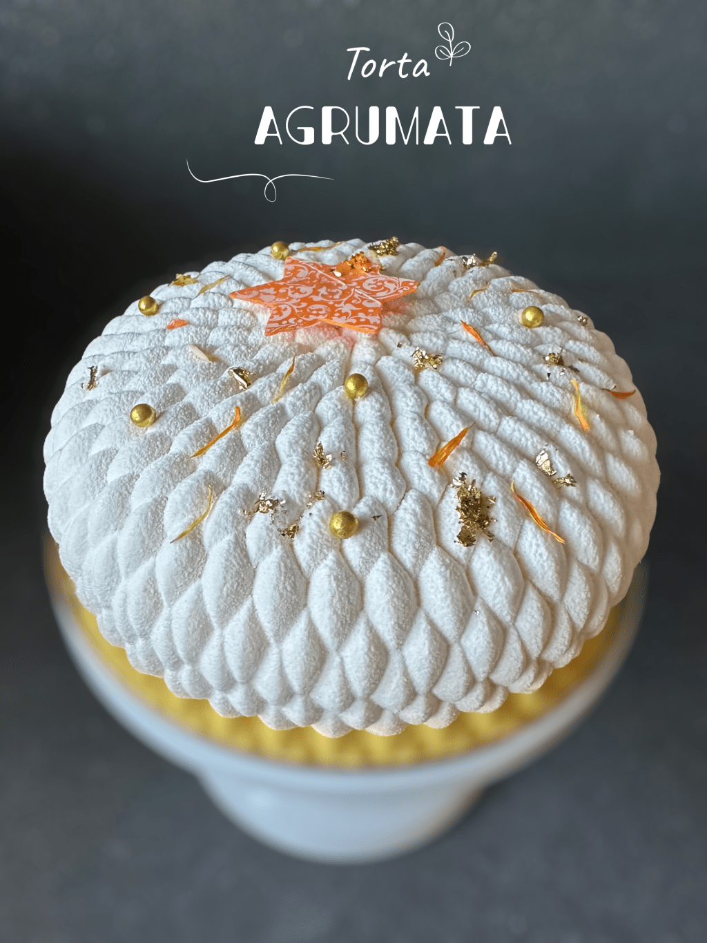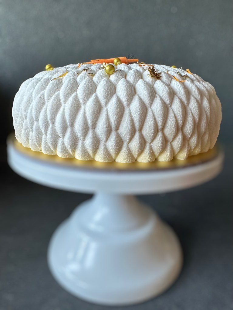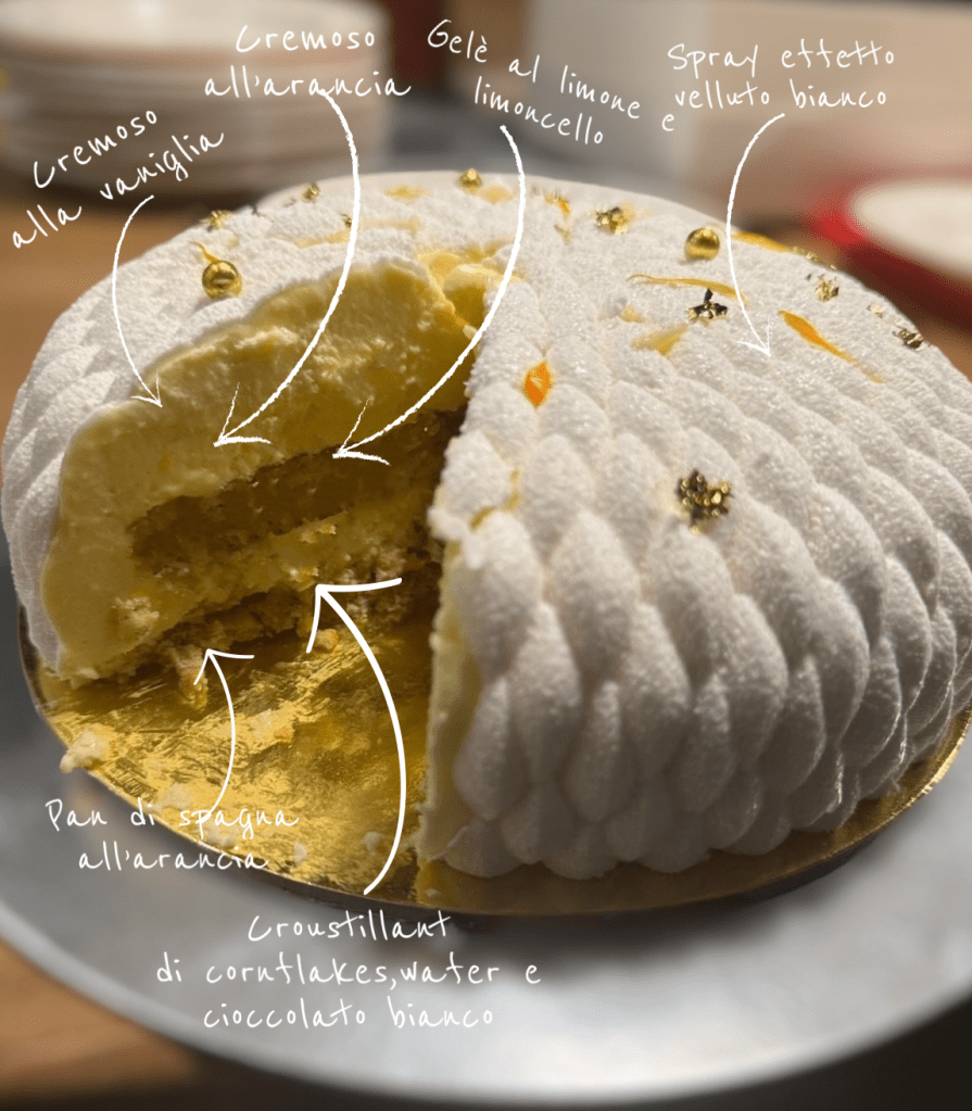 Questo torta è formata da una base spugnosa di pan di spagna all’arancia e mandorle da una base croccante di Croustillant di cornflakes, wafer e di cioccolato bianco , da un inserto di cremoso all’arancia, di gelè al limone, un pan di spagna all’arancia e croccante, da una parte esterna di cremoso alla vaniglia, una finitura di uno spray effetto velluto bianco