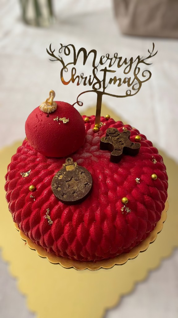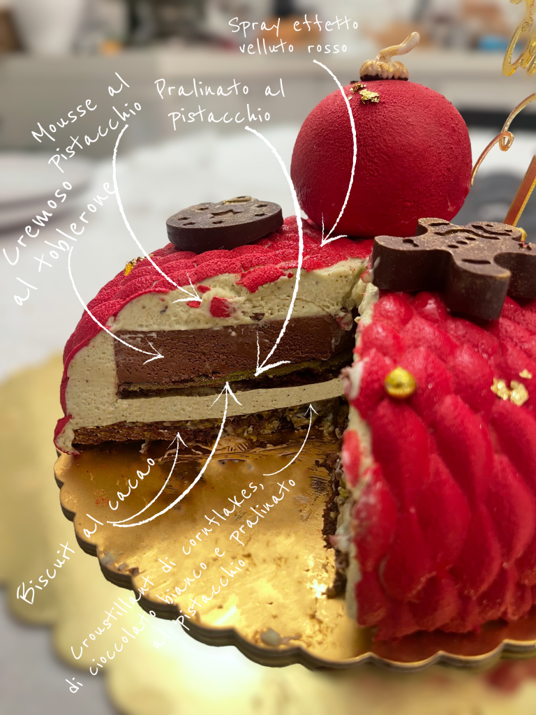 Questo torta è formata da una base spugnosa di biscuit al cacao, da una base croccante di Croustillant di cornflakes, di cioccolato bianco e pralinato al pistacchio, da un inserto di cremoso al toblerone, da un pralinato al pistacchio, un biscuit al cacao e croccante, da una parte esterna di mousse al pistacchio, una finitura di uno spray effetto velluto rosso