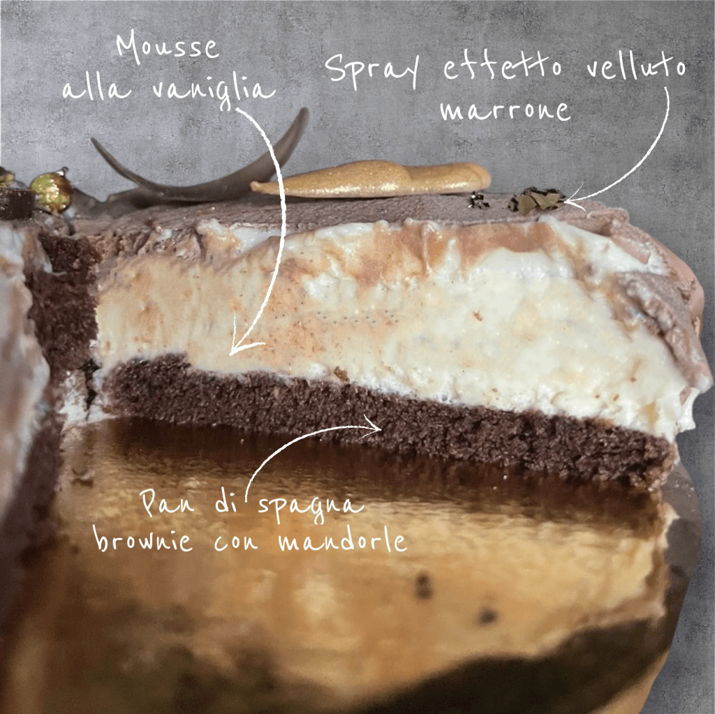 Questa torta è formata da una base spugnosa Pan di spagna brownie con mandorle , da una parte esterna di mousse alla vaniglia e una finitura di spray effetto velluto marrone