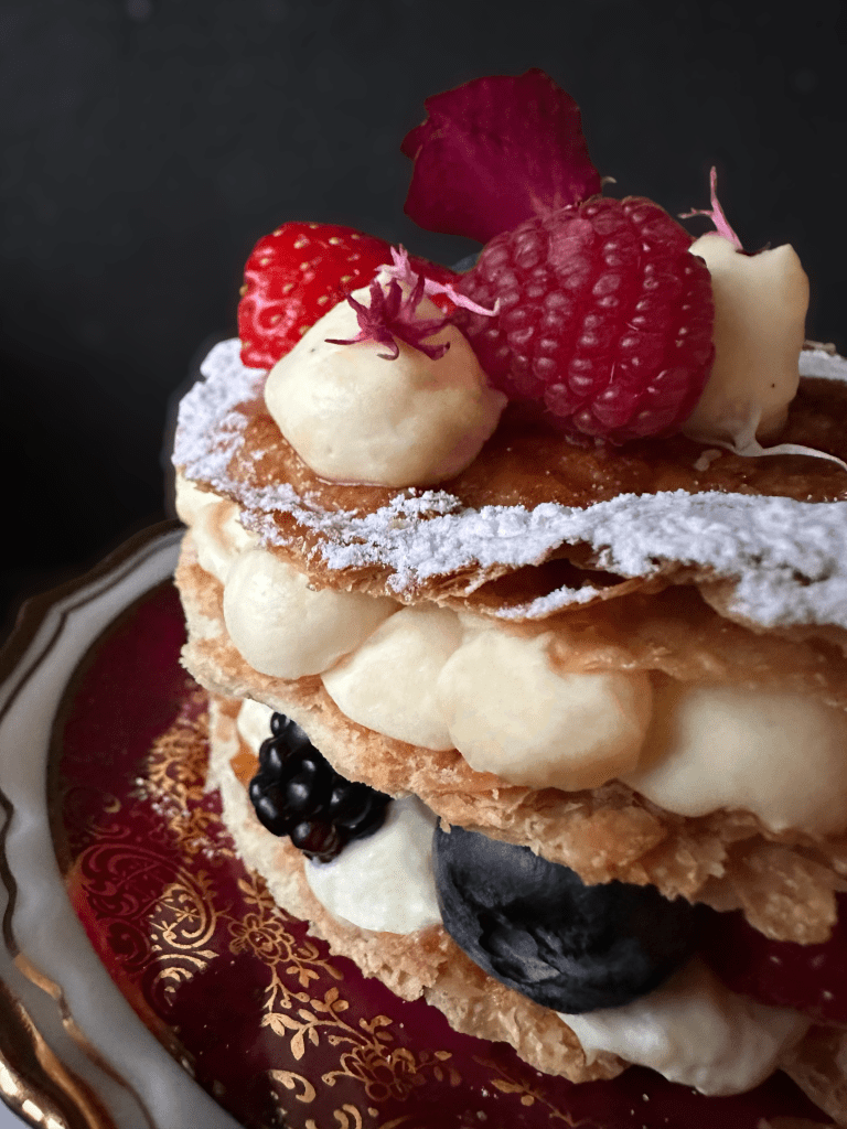 - Quando il tutto si sarà amalgamato, trasferiamo la crema in una sac a poche e assemblare la nostra millefoglie.