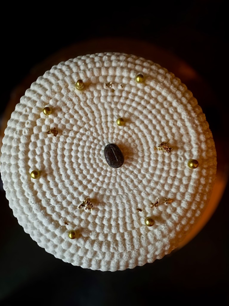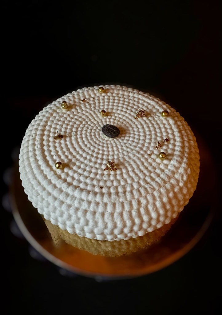 Questa torta è formata da una base spugnosa Pan di spagna al caffè , da un inserto di mousse al caffè e mousse al cioccolato da una parte esterna di bavarese al mascarpone e una finitura di spray effetto velluto bianco