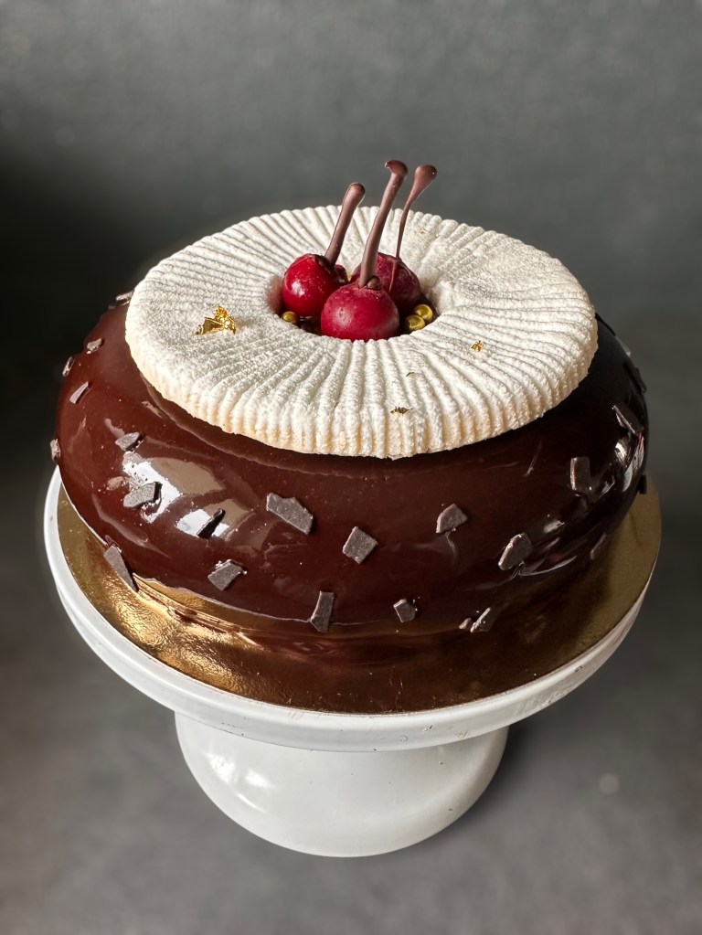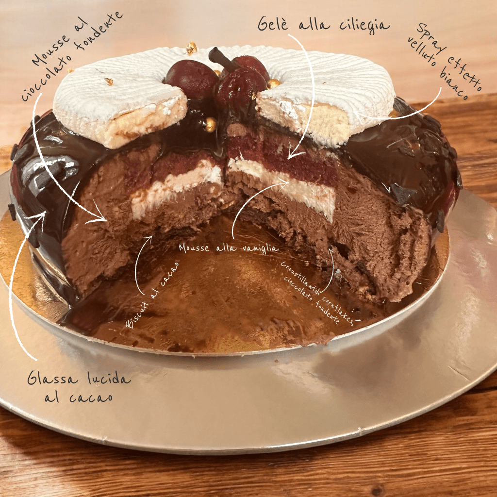 Questa torta è formata da una base spugnosa di biscuit al cacao , da una parte croccante di Croustillant di cornflakes, cioccolato fondente, da un inserto di mousse alla vaniglia e un Gelè alla ciliegia, da una parte esterna di mousse al cioccolato e una finitura di glassa a specchio al cacao e un top decorativo alla vaniglia con una finitura di spray effetto velluto bianco