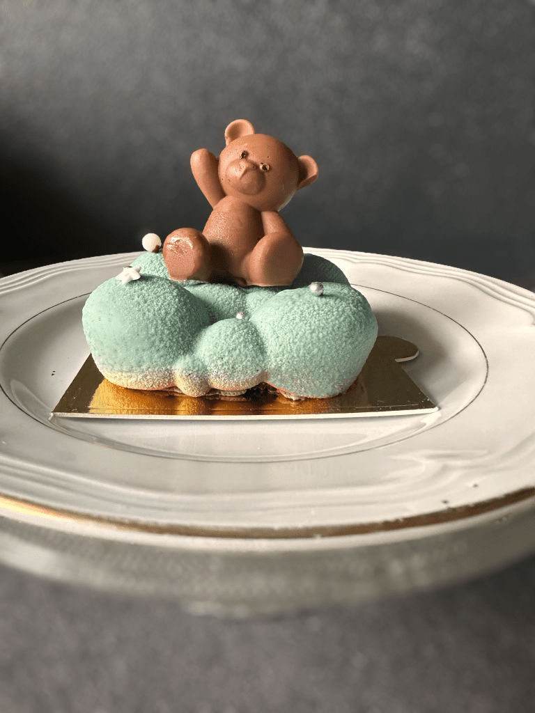 - Adagiare l’ orsetto di cioccolato sulla nuvola (vi consiglio di mettere un bastoncino di legno o uno stuzzicadenti quando lo riempite con il cioccolato, sarà più stabile sulla tortina)