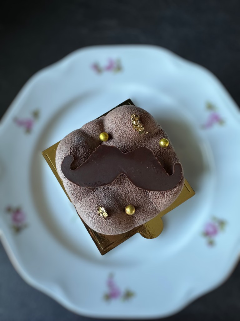 Stesso dolcino colorato con spray effetto velluto marone e decorato con dei baffi di cioccolato in occasione della festa del papà