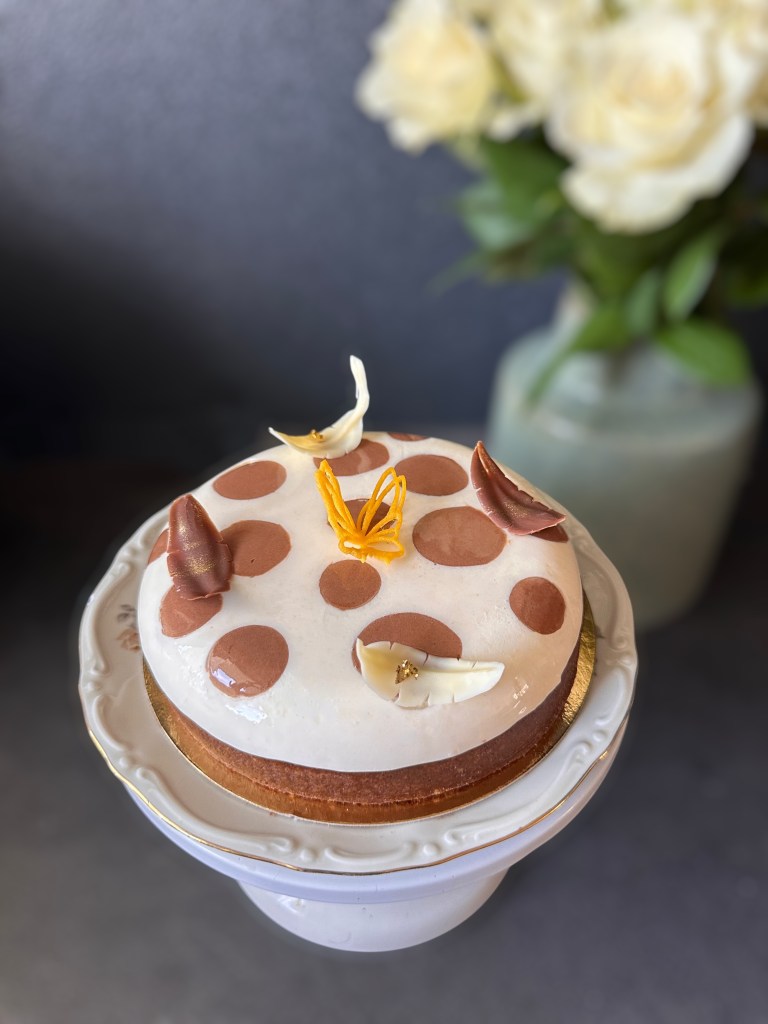 Questa crostata è un capolavoro di stratificazioni e contrasti: una base di pasta frolla al cacao, friabile e intensa, accoglie uno strato ricco di ganache al cioccolato e Baileys. Al centro, un soffice pan di Spagna, sapientemente bagnato al Baileys, regala umidità e profondo aroma. Successivamente, un ulteriore strato di ganache al cioccolato e Baileys avvolge il palato con la sua cremosità. Il tutto viene coronato da una delicata cupola, composta da un cremoso alla vaniglia impreziosito da pois di mousse al cioccolato, che aggiungono un tocco giocoso e raffinato. Infine, una glassa trasparente sigilla questa creazione, donandole lucentezza e un aspetto impeccabile