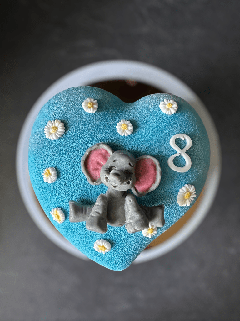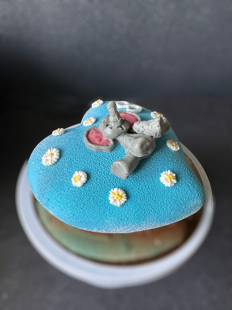Questa torta è formata da una base spugnosa di biscuit al cacao da una base crocconte di Croustillant di riso soffiato , cioccolato fondente, pralinato di nocciole , da un inserto formato da un cremoso alla vaniglia una mousse al nocciola , da una parte esterna di cremoso al cioccolato e da una finitura spray chablonage effetto velluto azzurro