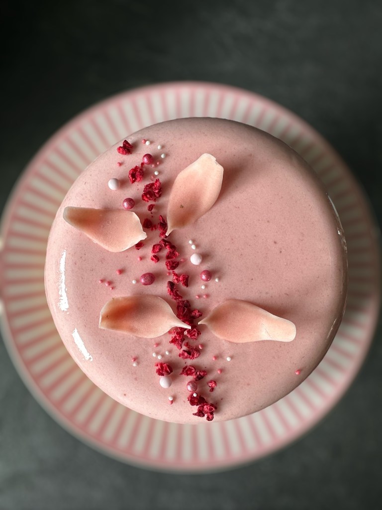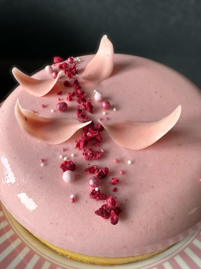 Questa crostata è formata da una pasta frolla alle mandorle , un biscuit alle mandorle con fragole disidratate, una ci fit di fragole una cupola alla mousse alle fragole , una glassa trasparente