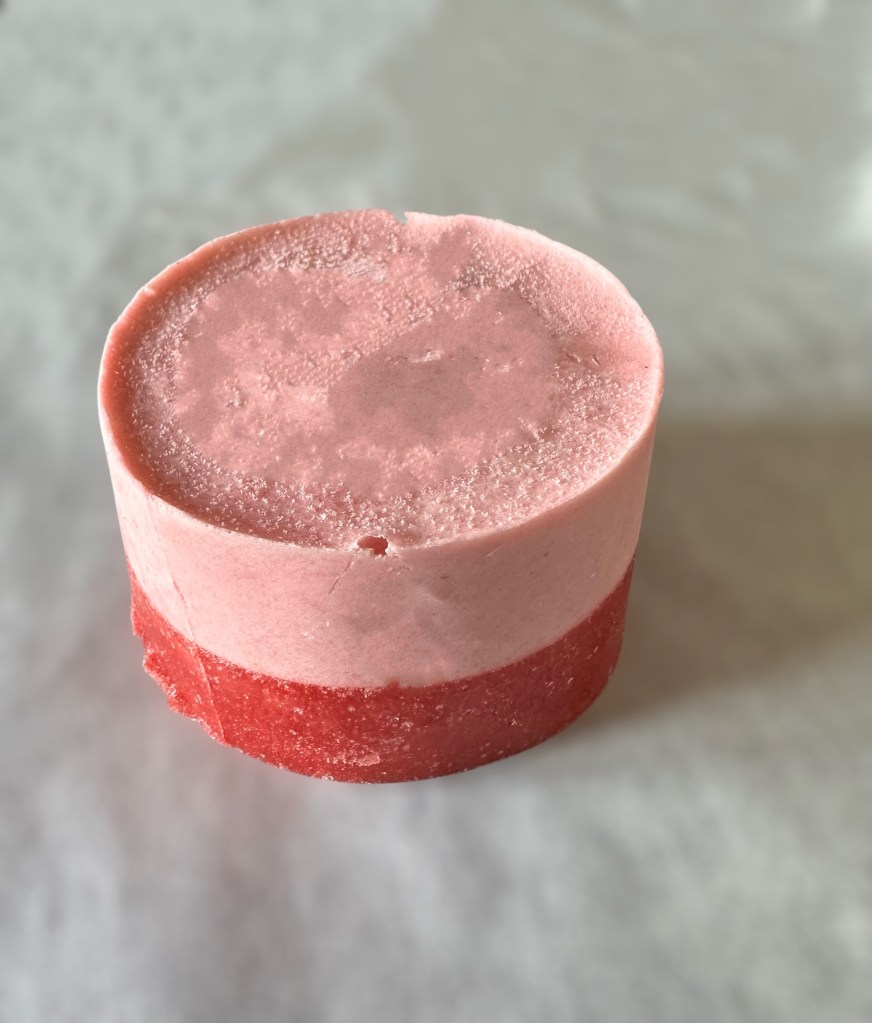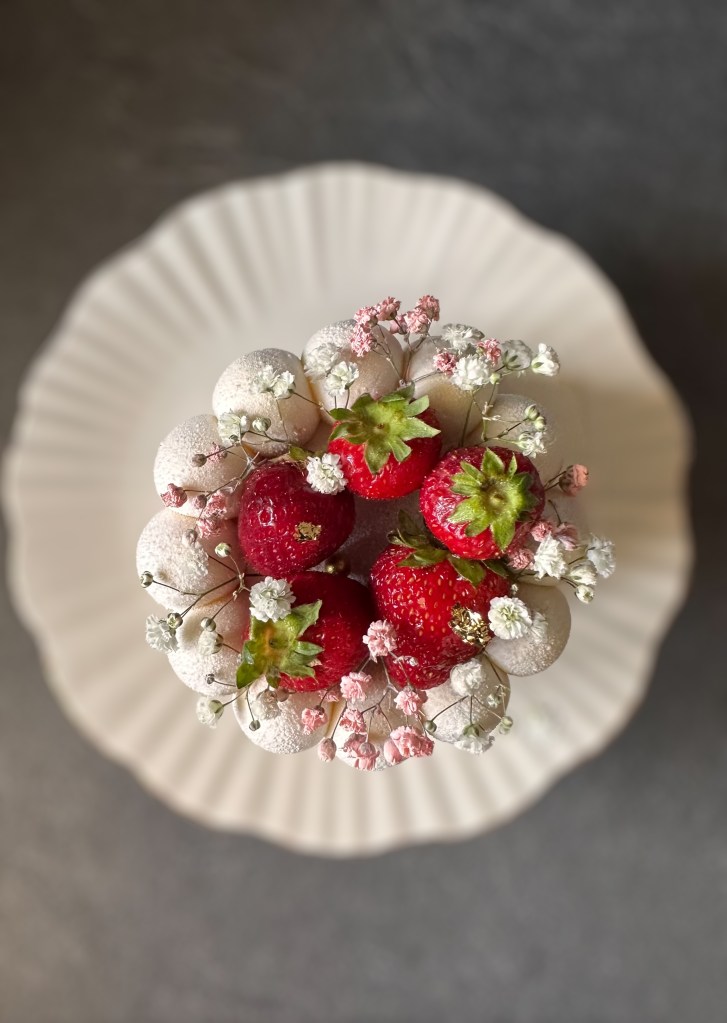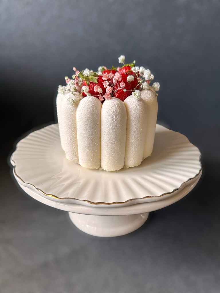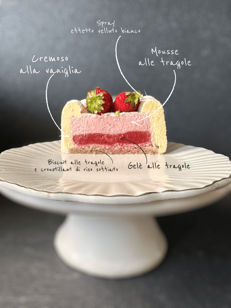 Questa torta è formata da una base spugnosa di biscuit alla fragola da una base croccante di Croustillant di riso soffiato , cioccolato ruby, fragole disidratate , da un inserto formato da una mousse alla fragola, e un gelè ale fragole da una parte esterna di cremoso allavaniglia e da una finitura spray chablonage effetto velluto bianco