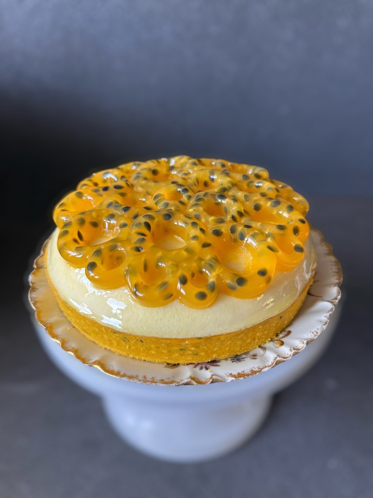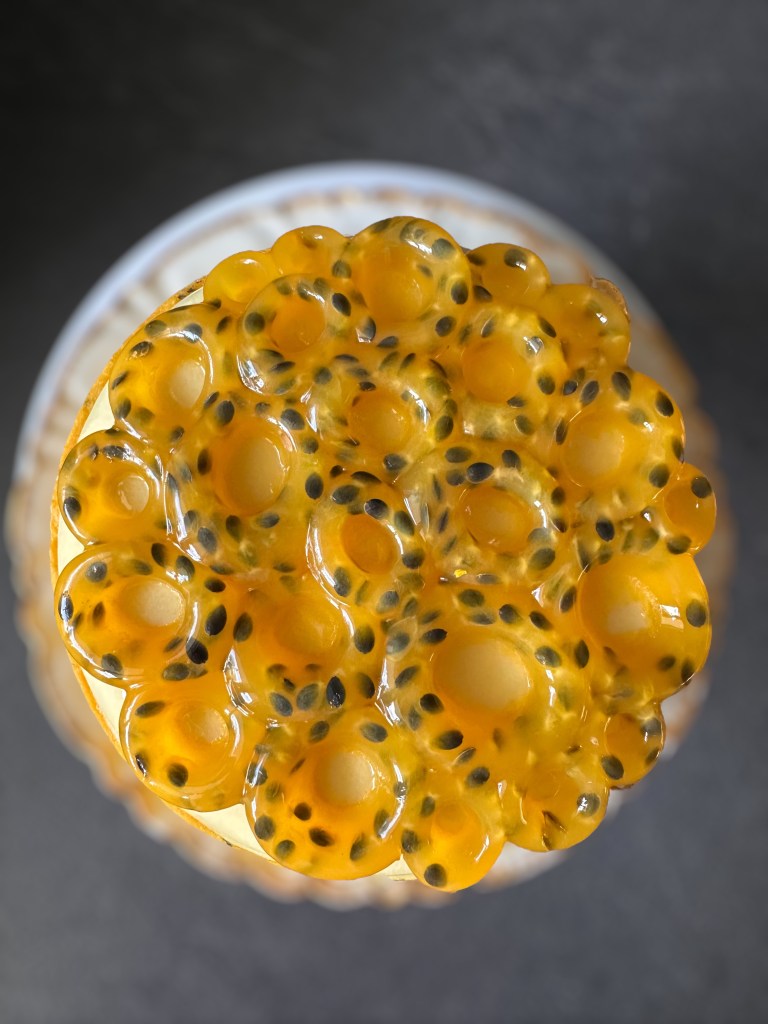 Questa crostata è formata da una pasta frolla alle mandorle con semi di sesamo neri, un biscuit alle mandorle con ananas, una confit di ananas, una cupola alla mousse alla frutta esotica , una glassa trasparente, una decorazione di gelè al frutto della passione