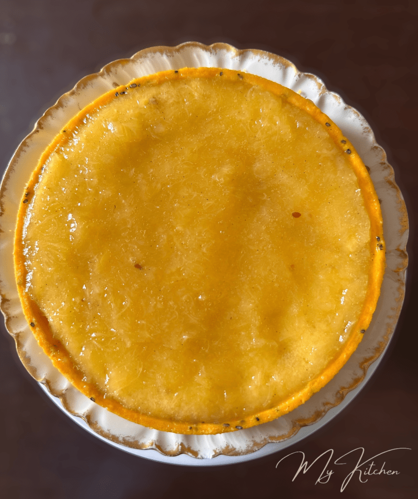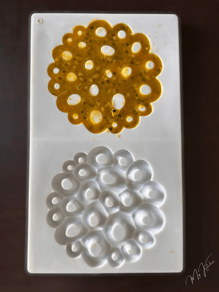 - Scaldare la polpa del frutto della passione con il succo di arancia e lime e lo zucchero in un pentolino, quindi sciogliere la gelatina.