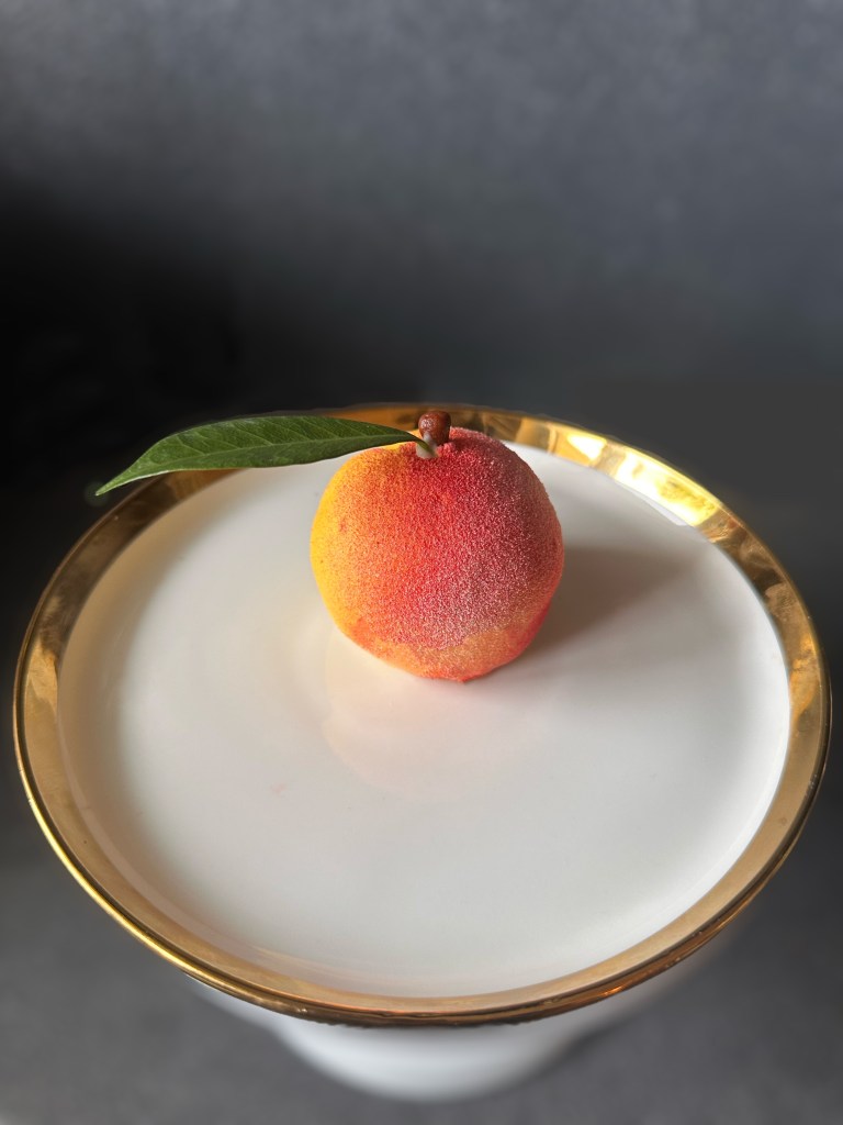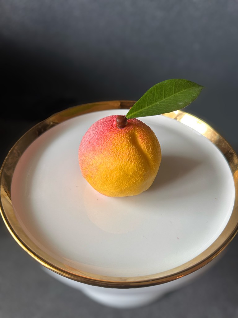 Mi erano avanzate delle preparazioni della crostata pesche e vaniglia e allora ho pensato perché non provate a fare una pesca in stile “Cedric Grolet”, pasticcere francese famoso per i suoi dessert a forma di fiori e di frutta. È noto per la creazione di dessert che hanno una somiglianza con i frutti da cui sono fatti. Per ottenere questo effetto, Grolet modella un sottile guscio di cioccolato bianco e lo aerografo per replicare l’aspetto e la consistenza di frutti