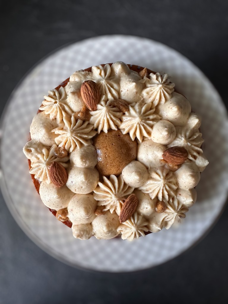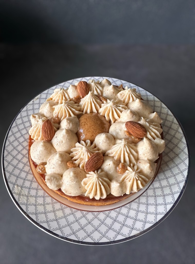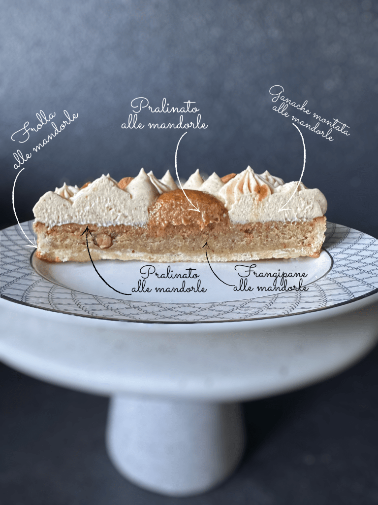 Questa crostata è formata da una pasta frolla alle mandorle un Frangipane alle mandorle e mandorle intere, un pralinato di mandorle, una una ganache montata alla mandorle