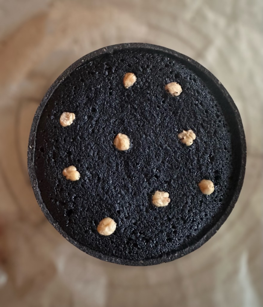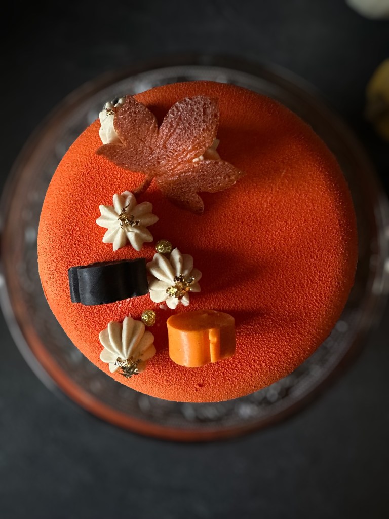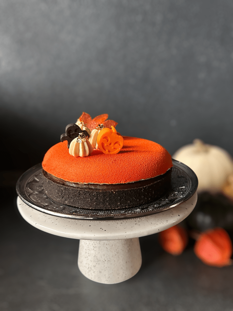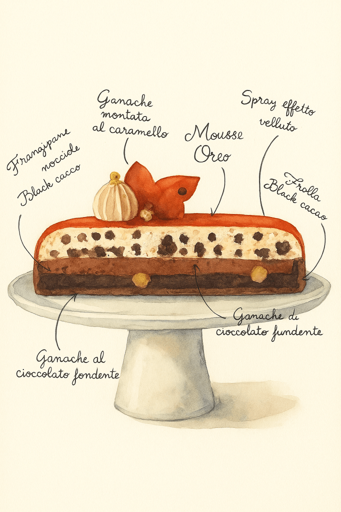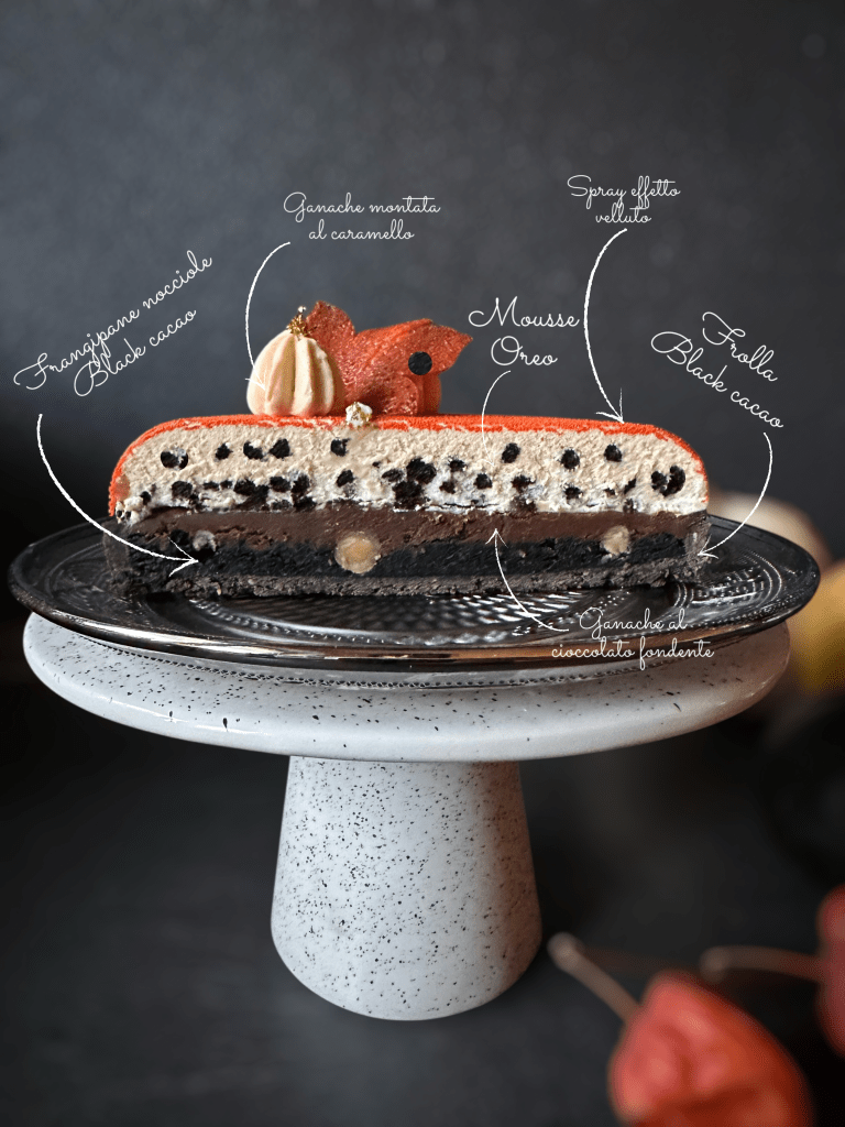 Questa crostata è formata da una pasta frolla al black cacao , un frangipane alle nocciole e black cacao, una ganache al cioccolato fondente,, una cupola di mousse all’OREO , una ganache montata al caramello ,una finitura di spray effetto velluto arancione