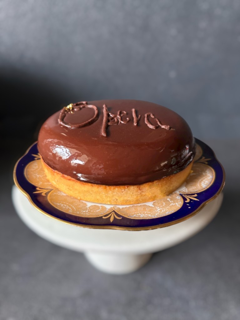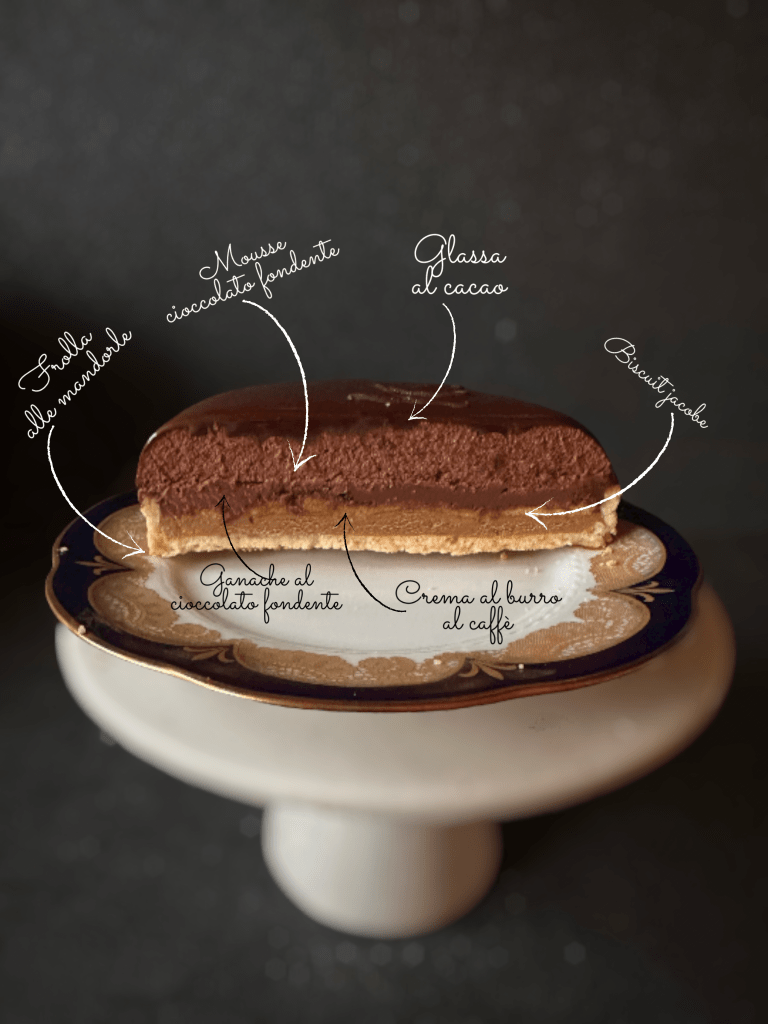 Questa crostata si è ispirata a questo tanto amato dolce francese ed è composta da da una pasta frolla alle mandorle , una crema al burro al caffe, un Biscuit Joconde, una ganache al cioccolato, una cupola al cioccolato fondente, una glassa a specchio al cacao