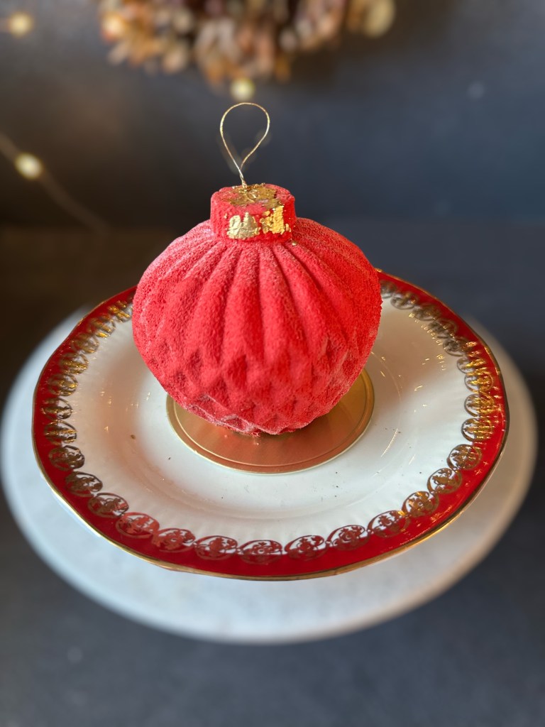 Questo dolce é formato da una base spugnosa di panettone, da un inserto formato da una mousse al cioccolato, da una parte esterna di mousse alla gianduia e da una finitura spray chablonage effetto velluto rosso