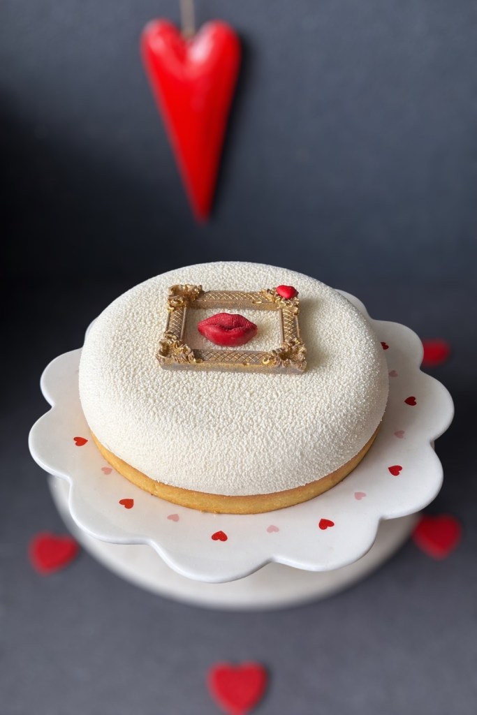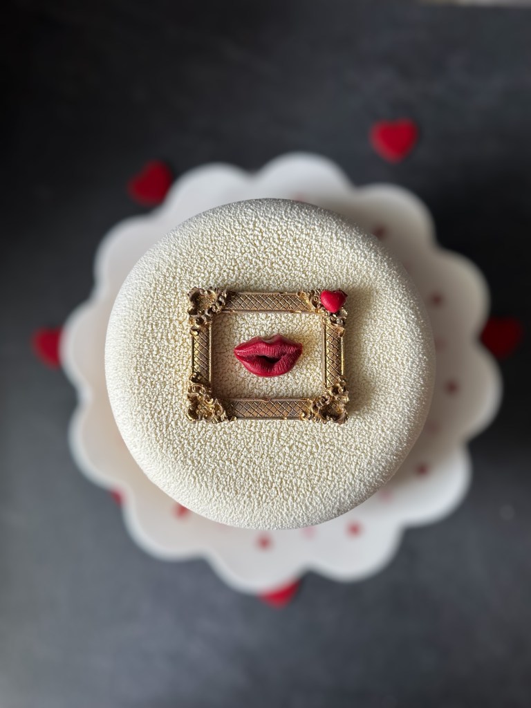 Questa crostata è formata da una pasta frolla alle mandorle un Frangipane alle mandorle e mandorle, unaganache al cioccolato, una cupola al cremoso mascarpone , uno spray effetto velluto bianco, decorazione in cioccolato