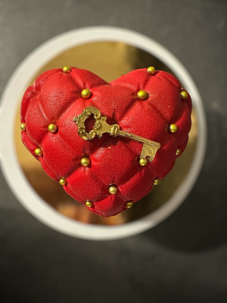 Questa torta è formata da una base spugnosa di biscuit,al cacao, da uno base crocconte di Croustillant di wafer , cioccolato fondente e pralinato di nocciole, da un inserto di cremoso alla vaniglia e una mousse alla nocciola , da una parte esterna di un cremoso al cioccolato fondente e da una finitura spray chablonage effetto velluto rosso