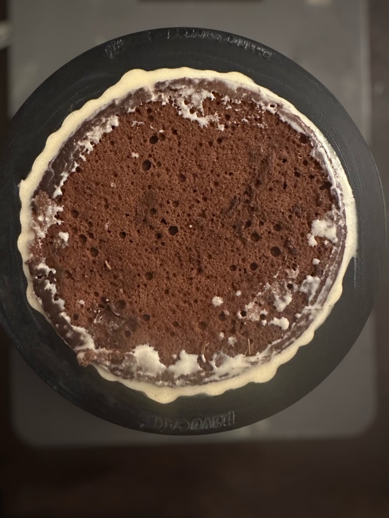 - Versare nello stampo con le due sac a poce procedere in modo circolare al centro sovrapponendo uno sopra l’altra le due mousse, ho messo anora uno strato di biscuit visto che mi era avanzato, versare ancora cremoso alla vaniglia